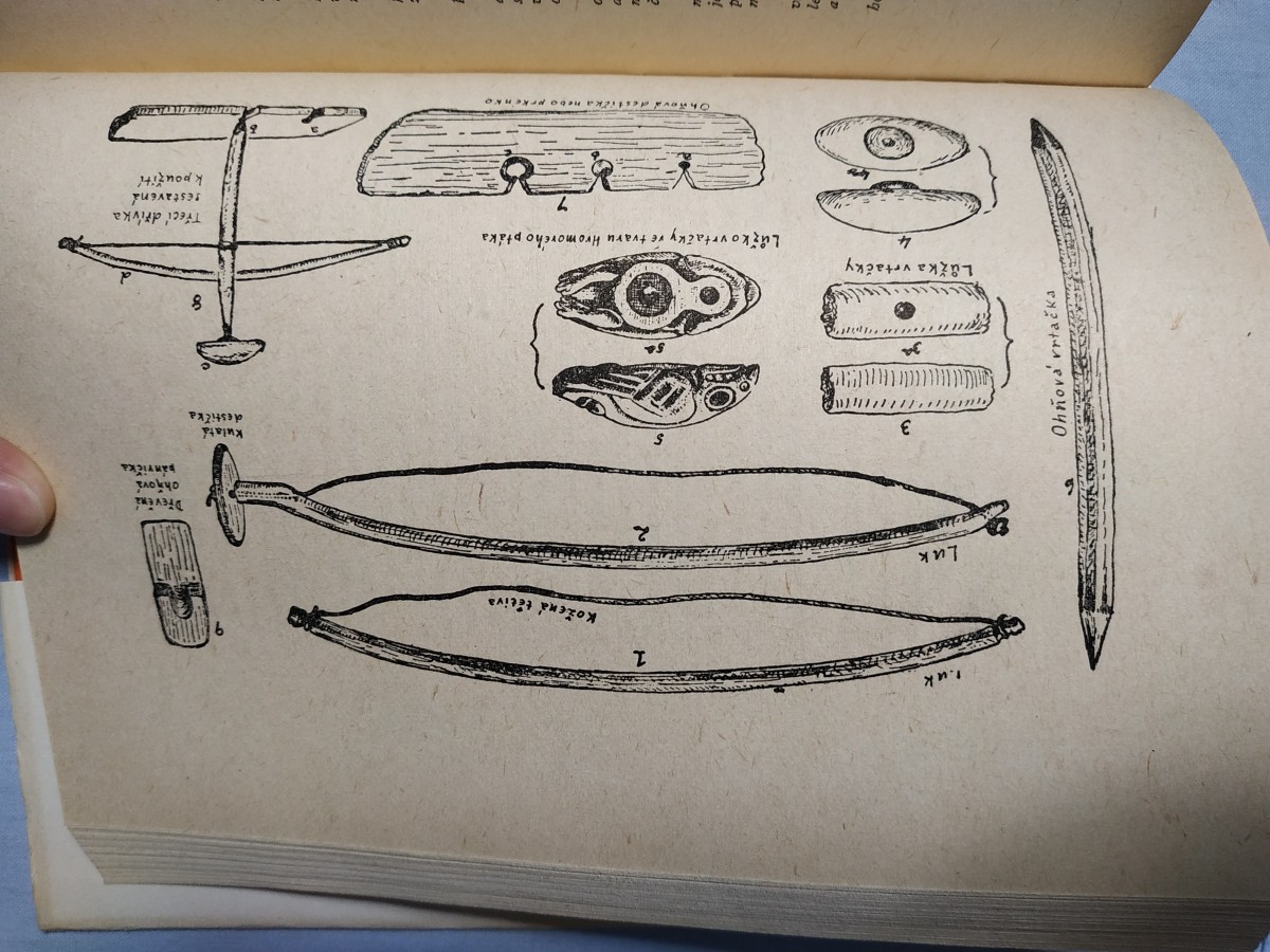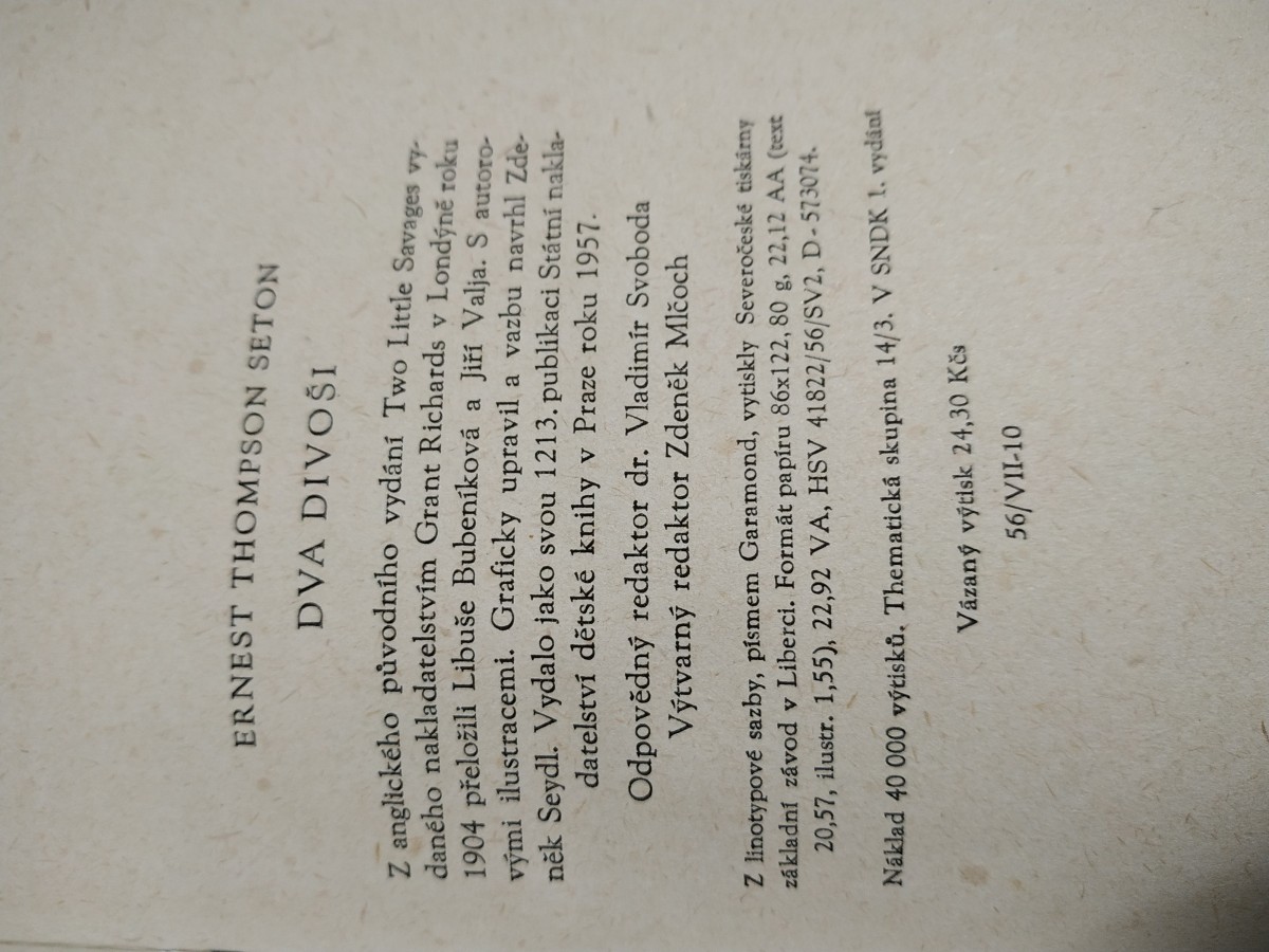 | Digitalizovaná tiráž: | ERNEST THOMPSON SETON DVA DIVOŠI 7 anglického původního vydání Two Little Savages vy. daného nakladatelstvím Grant Richards v Londýně roku 1904 přeložili Libuše Bubeníková a Jiří Valja. S autoro- vými ilustracemi. Graficky upravil a vazbu navrhl Zde- něk Seydl. Vydalo jako svou 1213. publikaci Státní nakla- datelství dětské knihy v Praze roku 1957. Odpovědný redaktor dr. Vladimír Svoboda Výtvarný redaktor Zdeněk Mlčoch Z linotypové sazby, písmem Garamond, vytiskly Severočeské tiskârny základní závod v Liberci. Formát papíru 86x122, 80 g, 22,12 AA (text 20,57, ilustr. 1,55), 22,92 VA, HSV 41822/56/SV2, D-573074. Náklad 40 000 výtisků. Thematická skupina 14/3. V SNDK 1. vydánl Vázaný výtisk 24,30 Kčs 56/VII-10 |