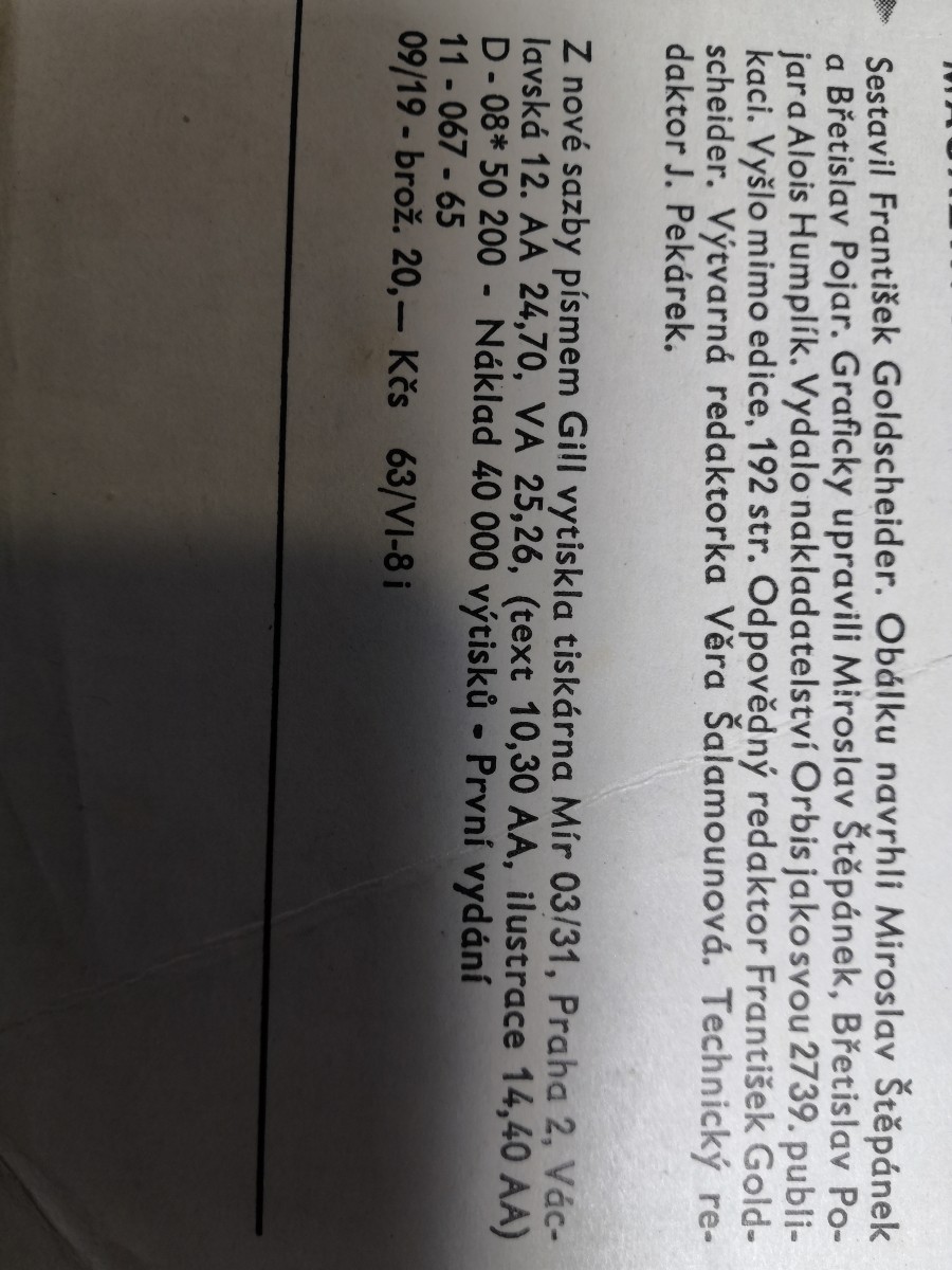 Digitalizovaná tiráž: | Sestavil František Goldscheider. Obálku navrhli Miroslav Štěpánek a Břetislav Pojar. Graficky upravili Miroslav Štěpánek, Břetislav Po- jara Alois Humplík. Vydalo nakladatelství Orbis jakosvou 2739. publi- kaci. Vyšlo mimo edice, 192 str. Odpovědný redaktor František Gold- scheider. Výtvarná redaktorka Věra Šalamounová. Technický re- daktor J. Pekárek. Z nové sazby písmem Gill vytiskla tiskárna Mir 03/31, Praha 2, Vác- lavská 12. AA 24,70, VÀ 25,26, (text 10,30 AA, ilustrace 14,40 AA) D- 08* 50 200 - Náklad 40 000 výtisků - První vydání 11 - 067 - 65 09/19- brož. 20,– Kčs 63/VI-8 i |