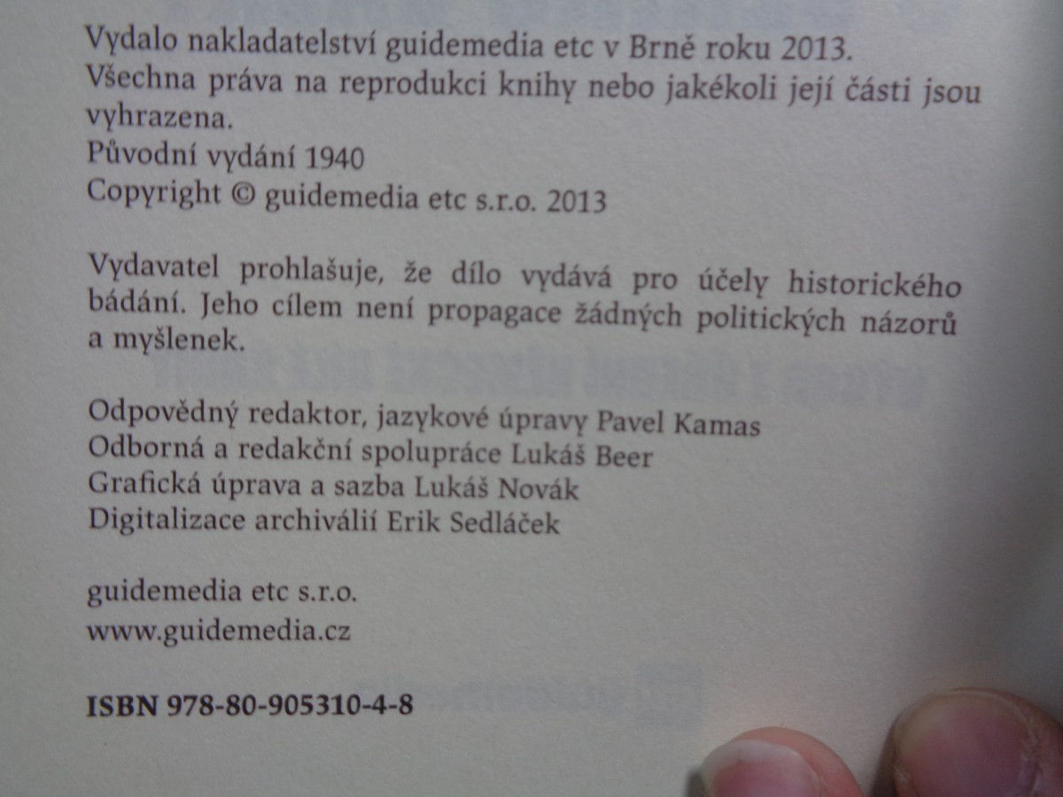 | Digitalizovaná tiráž: | Vydalo nakladatelství guidemedia etc v Brně roku 2013. Všechna práva na reprodukci knihy nebo jakékoli její části jsou vyhrazena. Původní vydání 1940 Copyright guidemedia etc s.r.o. 2013 Vydavatel prohlašuje, že dílo vydává pro účely historického bádání. Jeho cílem není propagace žádných politických názorů a myšlenek. Odpovědný redaktor, jazykové úpravy Pavel Kamas Odborná a redakční spolupráce Lukáš Beer Grafická úprava a sazba Lukáš Novák Digitalizace archiválií Erik Sedláček guidemedia etc s.r.o. www.guidemedia.cz ISBN 978-80-905310-4-8 |
