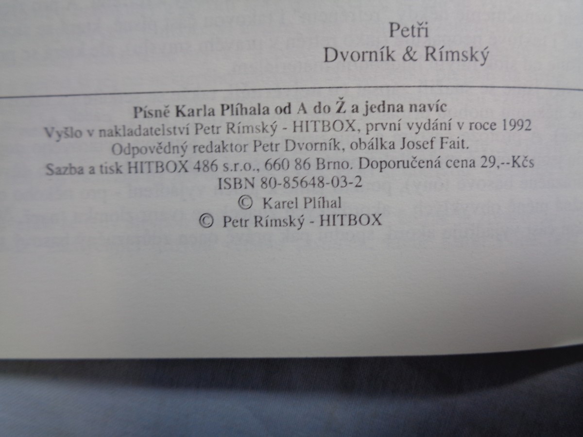 | Digitalizovaná tiráž: | Petři Dvorník & Rímský Písně Karla Plíhala od A do Ž a jedna navíc Vyšlo v nakladatelství Petr Rímský - HITBOX, první vydání v roce 1992 Odpovědný redaktor Petr Dvorník, obálka Josef Fait. Sazba a tisk HITBOX 486 s.r.o., 660 86 Brno. Doporučená cena 29,--Kčs ISBN 80-85648-03-2 Karel Plíhal Petr Rímský - HITBOX |