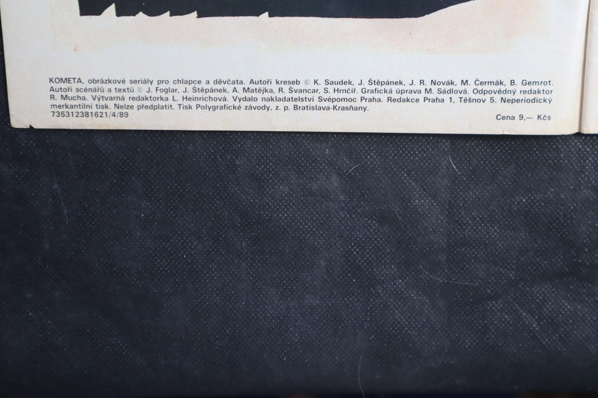 | Digitalizovaná tiráž: | KOMETA, obrázkové seriály pro chlapce a děvčata. Autoři kreseb K. Saudek, J. Štěpánek, J. R. Novák, M. Čermák, B. Gemrot. Autoři scénářů a textů J. Foglar, J. Štěpánek, A. Matějka, R. Švancar, S. Hrnčíř. Grafická úprava M. Sádlová. Odpovědný redaktor R. Mucha. Výtvarná redaktorka L. Heinrichová. Vydalo nakladatelství Svépomoc Praha. Redakce Praha 1, Těšnov 5. Neperiodický merkantilní tisk. Nelze předplatit. Tisk Polygrafické závody, z. p. Bratislava-Krasňany. 735312381621/4/89 Cena 9,- Kčs |