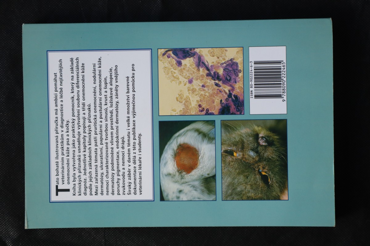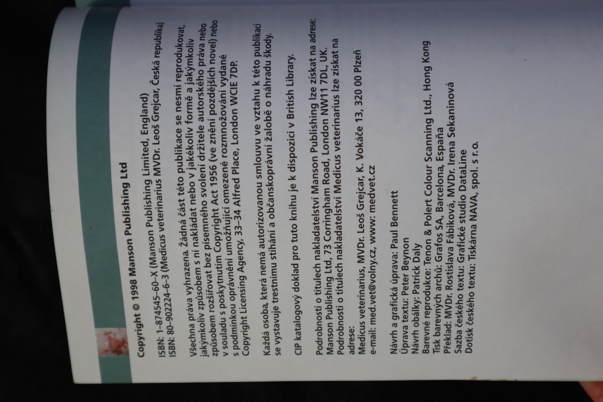 | Digitalizovaná tiráž: | Copyright © 1998 Manson Publishing Ltd ISBN: 1-874545-60-X (Manson Publishing Limited, England) ISBN: 80-902224-6-3 (Medicus veterinarius MVDr. Leoš Grejcar, Česká republika) Všechna práva vyhrazena. Žádná část této publikace se nesmí reprodukovat, jakýmkoliv způsobem s ní nakládat nebo v jakékoliv formě a jakýmkoliv způsobem rozšiřovat bez písemného svolení držitele autorského práva nebo v souladu s poskytnutím Copyright Act 1956 (ve znění pozdějších novel) nebo s podmínkou oprávnění umožňující omezené rozmnožování vydané Copyright Licensing Agency, 33-34 Alfred Place, London WCIE 7DP. Každá osoba, která nemá autorizovanou smlouvu ve vztahu k této publikaci se vystavuje trestnímu stíhání a občanskoprávní žalobě o náhradu škody. CIP katalogový doklad pro tuto knihu je k dispozici v British Library. Podrobnosti o titulech nakladatelství Manson Publishing lze získat na adrese: Manson Publishing Ltd, 73 Corringham Road, London NW11 7DL, UK. Podrobnosti o titulech nakladatelství Medicus veterinarius lze získat na adrese: Medicus veterinarius, MVDr. Leoš Grejcar, K. Vokáče 13, 320 00 Plzeň e-mail: med.vet@volny.cz, www: medvet.cz Návrh a grafická úprava: Paul Bennett Úprava textu: Peter Beynon Návrh obálky: Patrick Daly Barevné reprodukce: Tenon & Polert Colour Scanning Ltd., Hong Kong Tisk barevných archů: Grafos SA, Barcelona, Espaňa Překlad: MVDr. Rostislava Fábiková, MVDr. Irena Sekaninová Sazba českého textu: Grafické studio DataLine Dotisk českého textu: Tiskárna NAVA, spol. s r. o. |