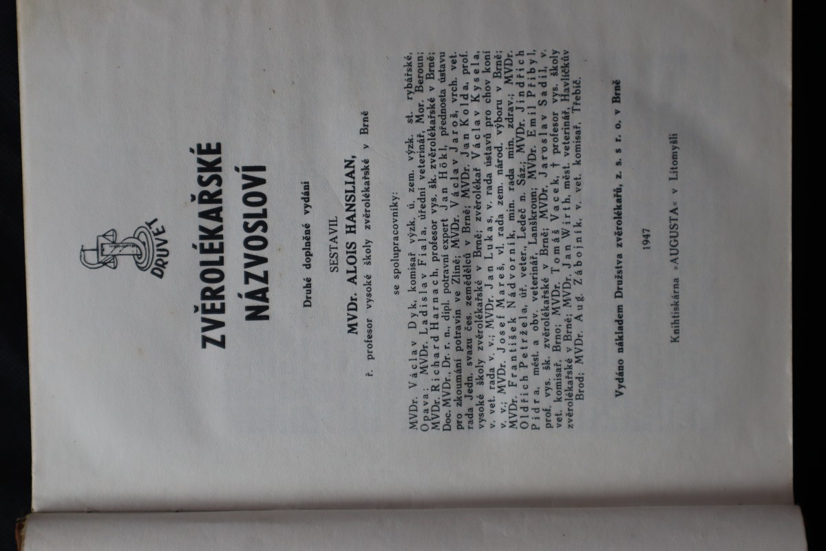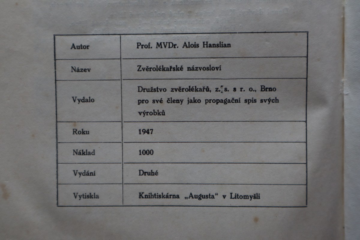 | Digitalizovaná tiráž: | Autor Prof. MVDr. Alois Hanslian Název Vydalo Zvěrolékařské názvosloví Družstvo zvěrolékařů, z. s. s r. o., Brno pro své členy jako propagační spis svých výrobků Roku 1947 Náklad 1000 Vydání Druhé Vytiskla Knihtiskárna Augusta" v Litomyšli |