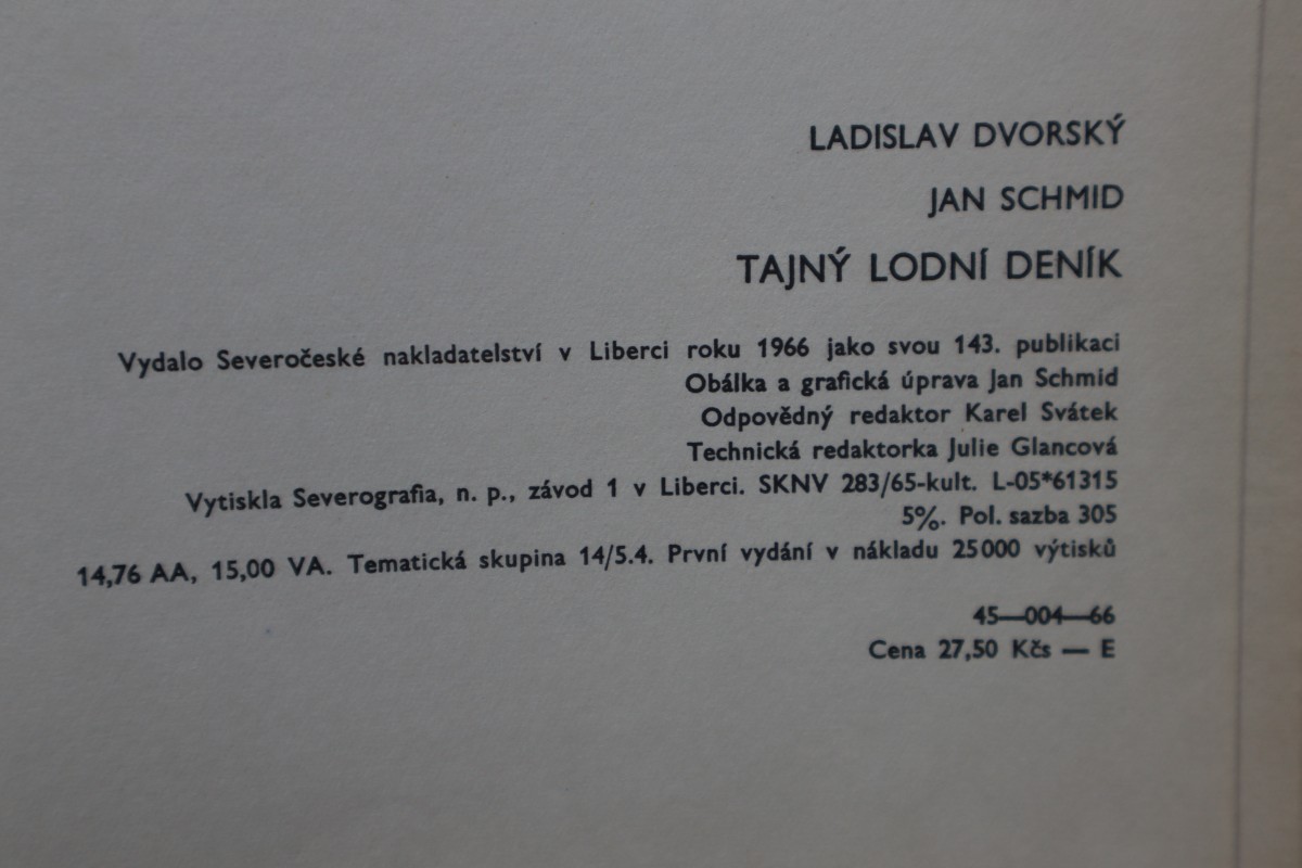 | Digitalizovaná tiráž: | LADISLAV DVORSKÝ JAN SCHMID TAJNÝ LODNÍ DENÍK Vydalo Severočeské nakladatelství v Liberci roku 1966 jako svou 143. publikaci Obálka a grafická úprava Jan Schmid Odpovědný redaktor Karel Svátek Technická redaktorka Julie Glancová Vytiskla Severografia, n. p., závod 1 v Liberci. SKNV 283/65-kult. L-05*61315 5%. Pol. sazba 305 14,76 AA, 15,00 VA. Tematická skupina 14/5.4. První vydání v nákladu 25000 výtisků 45-004-66 Cena 27,50 Kčs - E |
