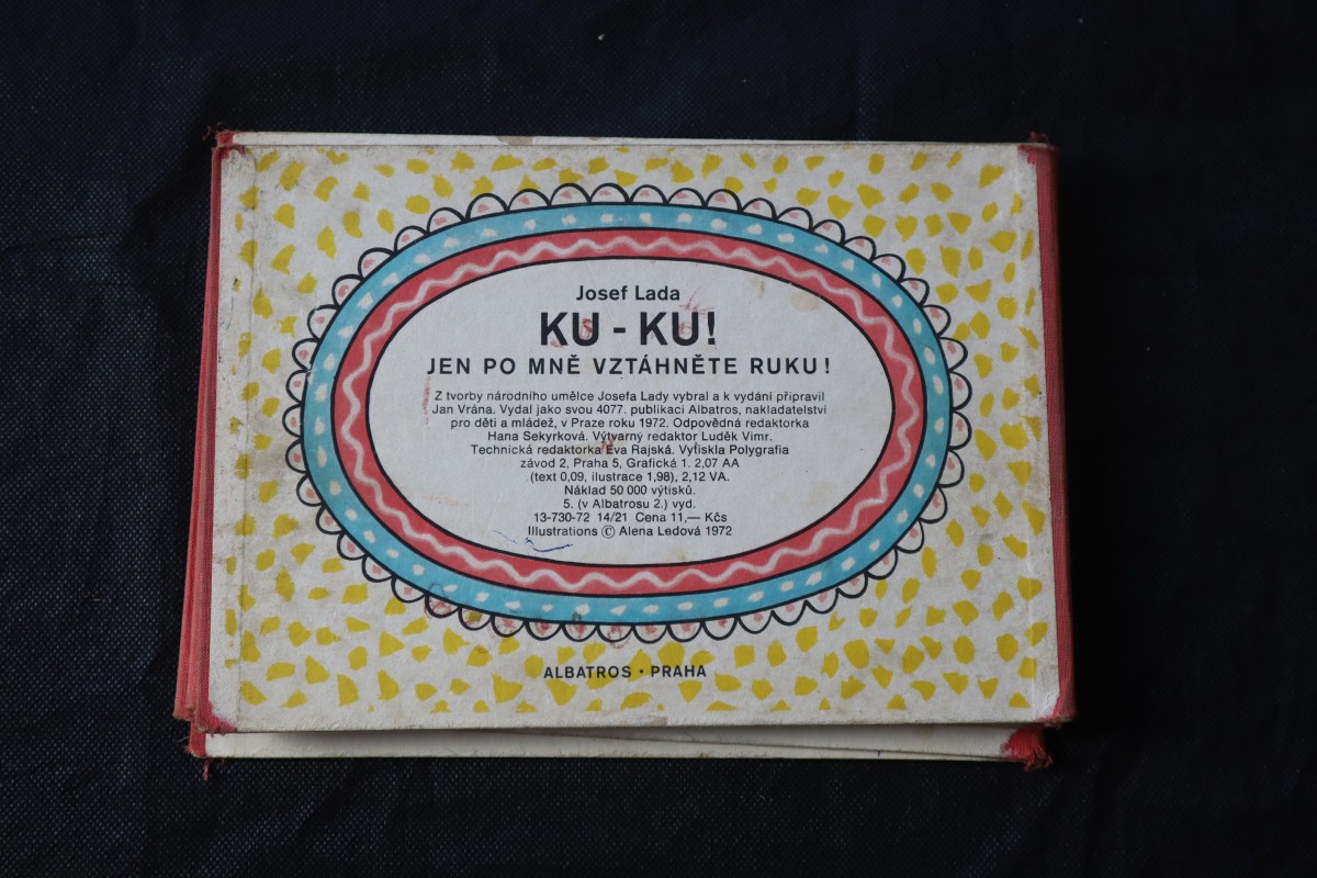 | Digitalizovaná tiráž: | Josef Lada KU - KU! JEN PO MNĚ VZTÁHNĚTE RUKU! Z tvorby národního umělce Josefa Lady vybral a k vydání připravil Jan Vrána. Vydal jako svou 4077. publikaci Albatros, nakladatelství pro děti a mládež, v Praze roku 1972. Odpovědná redaktorka Hana Sekyrková. Výtvarný redaktor Luděk Vimr. Technická redaktorka Eva Rajská. Vytiskla Polygrafia závod 2, Praha 5, Grafická 1. 2,07 AA (text 0,09, ilustrace 1,98), 2,12 VA. Náklad 50 000 výtisků. 5. (v Albatrosu 2.) vyd. 13-730-72 14/21 Cena 11,- Kčs Illustrations Alena Ladová 1972 |