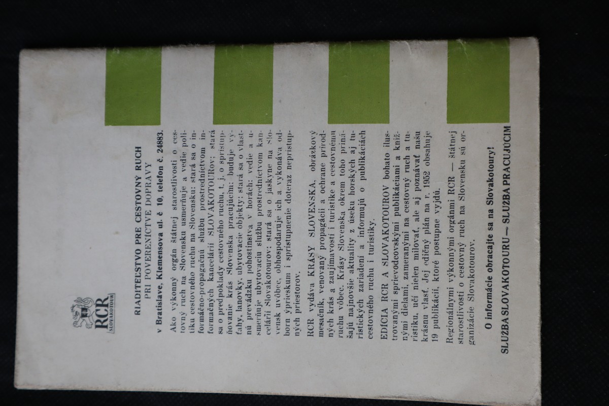 | Digitalizovaná tiráž: | Chaty a útulne v slovenských horách - Publikácia Riaditeľ- stva pre cestovný ruch pri Povereníctve dopravy v Bratislave Edícia RCR a Slovakotourov, sväzok 1. propagačné oddelenie RCR. III/1. archív RCR. doline. - Sostavilo Tlačovo- Schválené PIO č. j. 32171/1951- Návrh obálky: Ateliér Slovtouru. Fotografie: Foto- Na obálke: Chata pod Sokolím vo Vrátnej Nákladom Slovtouru v Lipt. Mikuláši roku 1951 Tlač Stredoslovenské tlačiarne, v počte 10.000 výtlačkov. n. p., Z. z., Martin. - Cena Kčs 16.- 47 |