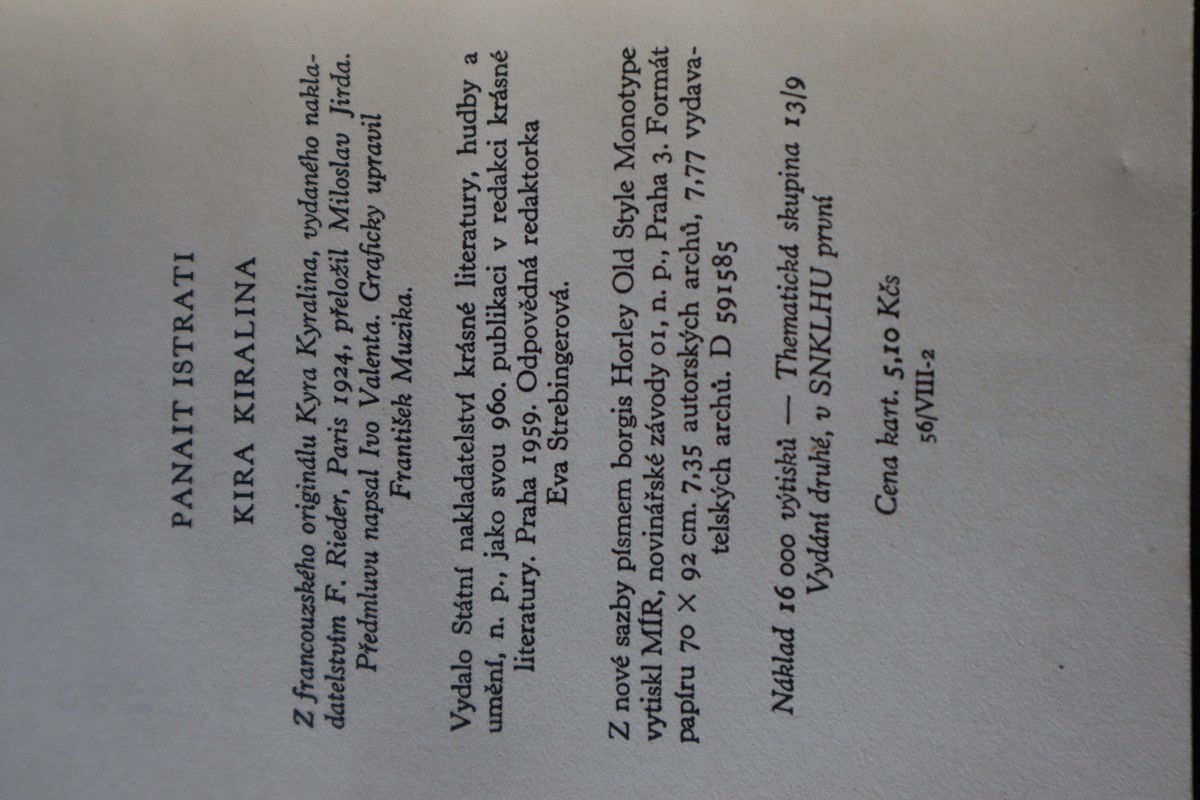 | Digitalizovaná tiráž: | PANAIT ISTRATI KIRA KIRALINA Z francouzského originálu Kyra Kyralina, vydaného nakla- datelstvím F. Rieder, Paris 1924, přeložil Miloslav Jirda. Předmluvu napsal Ivo Valenta. Graficky upravil František Muzika. Vydalo Státní nakladatelství krásné literatury, hudby a umění, n. p., jako svou 960. publikaci v redakci krásné literatury. Praha 1959. Odpovědná redaktorka Eva Strebingerová. Z nové sazby písmem borgis Horley Old Style Monotype vytiskl MÍR, novinářské závody o1, n. p., Praha 3. Formát papíru 70 X 92 cm. 7,35 autorských archů, 7,77 vydava- telských archů. D 591585 Náklad 16 000 výtisků - Thematická skupina 13/9 Vydání druhé, v SNKLHU první Cena kart. 5,10 Kčs 56/VIII-2 |