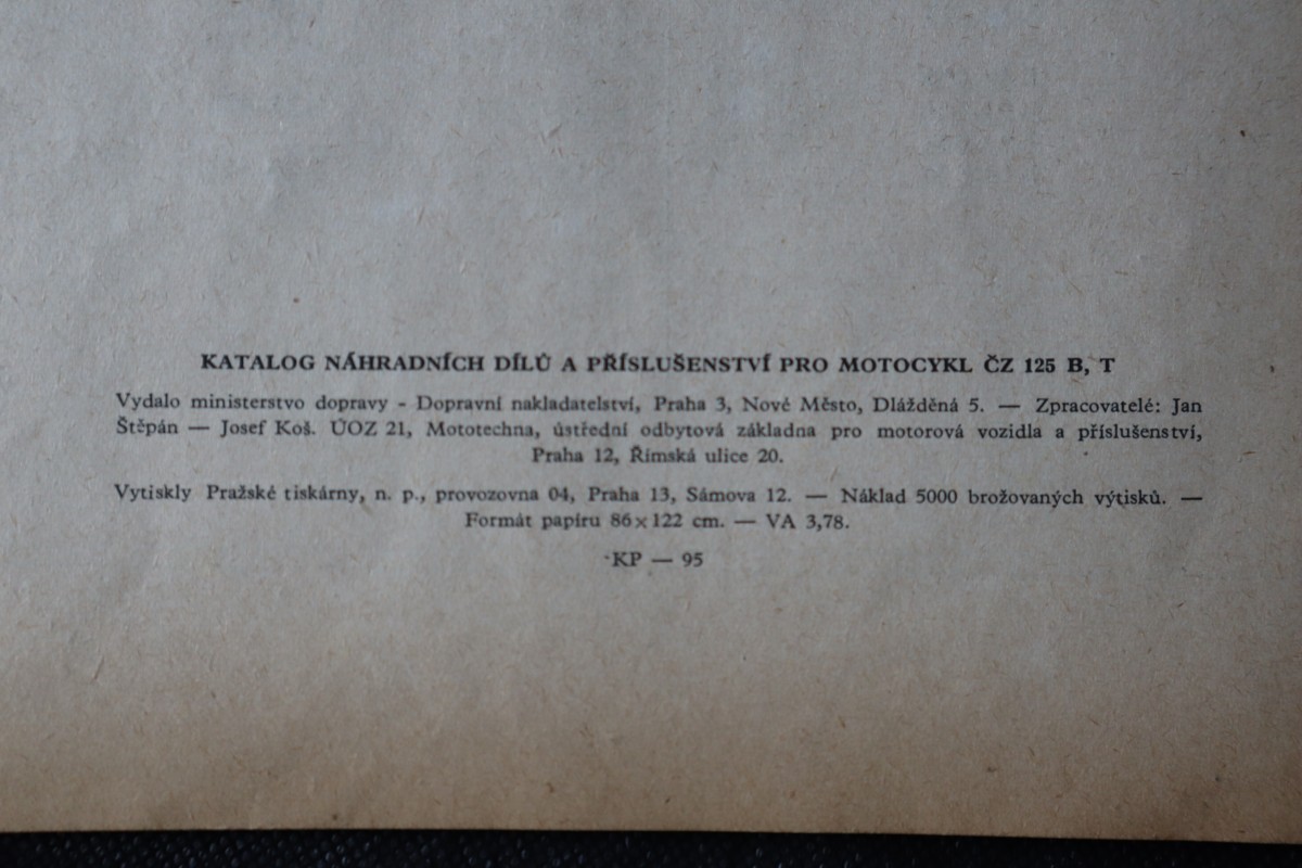 | Digitalizovaná tiráž: | KATALOG NÁHRADNÍCH DÍLŮ A PŘÍSLUŠENSTVÍ PRO MOTOCYKL ČZ 125 B, T Vydalo ministerstvo dopravy - Dopravní nakladatelství, Praha 3, Nové Město, Dlážděná 5. Stěpán - - Zpracovatelé: Jan Josef Koš. UOZ 21, Mototechna, ústřední odbytová základna pro motorová vozidla a příslušenství, Praha 12, Rimská ulice 20. Vytiskly Pražské tiskárny, n. p., provozovna 04, Praha 13, Sámova 12. Formát papiru 86 x 122 cm. VA 3,78. KP-95 - Náklad 5000 brožovaných výtisků. - |