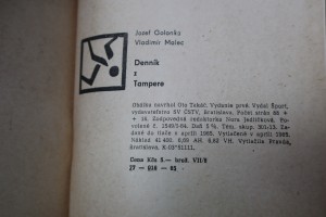 | Digitalizovaná tiráž: | Jozef Golonka Vladimír Malec Denník Z Tampere Obálku navrhol Oto Takáč. Vydanie prvé. Vydal Sport, vydavateľstvo SV ČSTV, Bratislava. Počet strán 88 + +16. Zodpovedná redaktorka Nora Jedličková. Po- volené č. 1549/1-64. Daň 5 %. Tém. skup. 301,13. Za- dané do tlače v apríli 1965. Vytlačené v apríli 1965. Náklad 41 400. 6,69 AH. 6,82 VH. Vytlačila Pravda, Bratislava. K-03*51111. Cena Kčs 5.- brož. VII/8 77 - 018 65 |