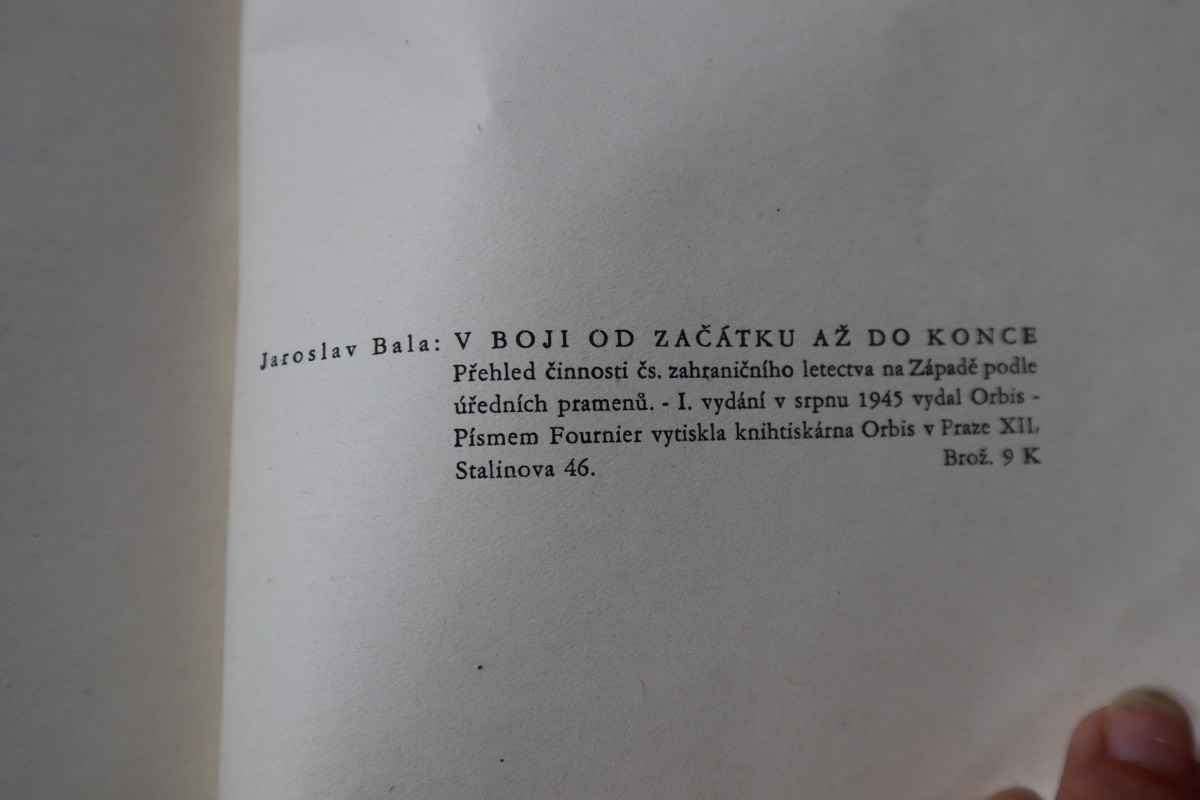 | Digitalizovaná tiráž: | Jaroslav Bala: V BOJI OD ZAČÁTKU AŽ DO KONCE Přehled činnosti čs. zahraničního letectva na Západě podle úředních pramenů. - I. vydání v srpnu 1945 vydal Orbis - Písmem Fournier vytiskla knihtiskárna Orbis v Praze XII, Stalinova 46. Brož. 9 K |