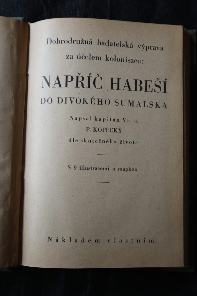 | Digitalizovaná tiráž: | Dobrodružná badatelská výprava za účelem kolonisace: NAPŘÍČ HABEŠÍ DO DIVOKÉHO SUMALSKA Napsal kapitán Vr. a. P. KOPECKÝ dle skutečného života S 9 illustracemi a mapkou Nákladem vlastním |