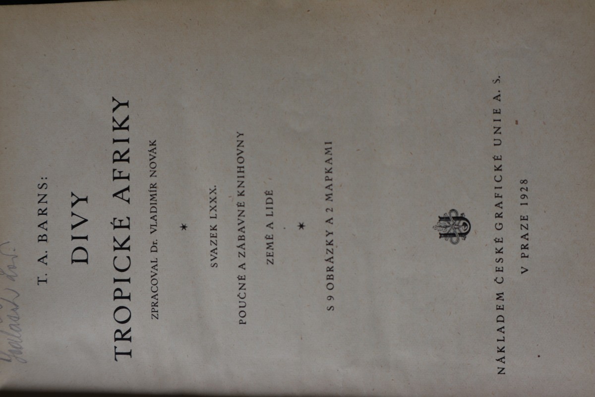 | Digitalizovaná tiráž: | Yalas dos T. A. BARNS: DIVY TROPICKE AFRIKY ZPRACOVAL Dr. VLADIMÍR NOVÁK * SVAZEK LXXX. POUČNÉ A ZÁBAVNÉ KNIHOVNY ZEMĚ A LIDÉ S 9 OBRÁZKY A 2 MAPKAMI NÁKLADEM ČESKÉ GRAFICKÉ UNIE A. S. V PRAZE 1928 |