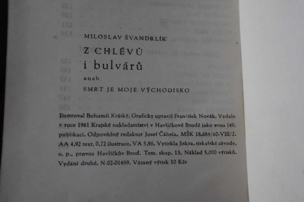| Digitalizovaná tiráž: | BSI IEI PEI OPI 021 MILOSLAV ŠVANDRLIK IZ CHLÉVŮ inste i bulvárů aneb SMRT JE MOJE VÝCHODISKO Ilustroval Bohumil Krátký. Graficky upravil František Novák. Vydalo v roce 1961 Krajské nakladatelství v Havlíčkově Brodě jako svou 149. publikaci. Odpovědný redaktor Josef Čábela. MŠK 18.684/60-VIII/2. AA 4,92 text, 0,72 ilustrace, VA 5,96. Vytiskla Jiskra, tiskařské závody, n. p., provoz Havlíčkův Brod. Tem. skup. 13. Náklad 5.000 výtisků. Vydání druhé. N-02-01489. Vázaný výtisk 10 Kčs |