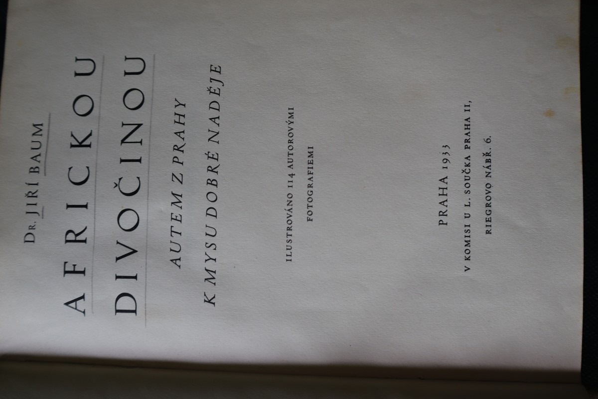 | Digitalizovaná tiráž: | DR. JIŘÍ BAUM AFRICKOU DIVOČINOU AUTEM Z PRAHY K MYSU DOBRÉ NADĚJE ILUSTROVÁNO 114 AUTOROVÝMI FOTOGRAFIEMI PRAHA 1933 V KOMISI U L. SOUČKA PRAHA II, RIEGROVO NÁBŘ. 6. |