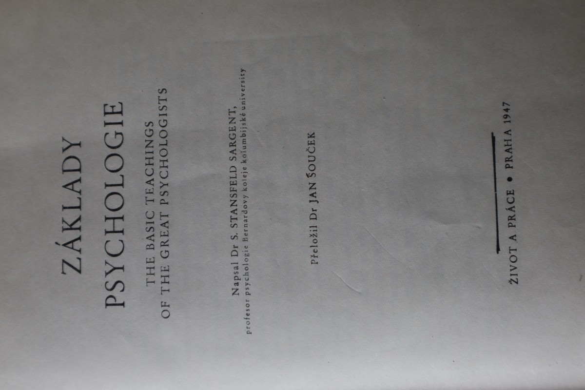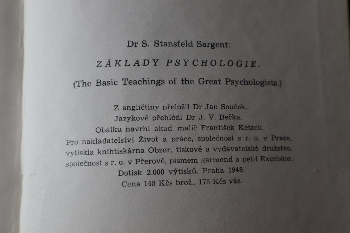 | Digitalizovaná tiráž: | Dr S. Stansfeld Sargent: ZÁKLADY PSYCHOLOGIE. (The Basic Teachings of the Great Psychologists.) Z angličtiny přeložil Dr Jan Souček. Jazykově přehlédl Dr J. V. Bečka. Obálku navrhl akad. malíř František Ketzek. Pro nakladatelstvi Život a práce, společnost s r. o. v Praze, vytiskla knihtiskárna Obzor, tiskové a vydavatelské družstvo, společnost s r. o. v Přerově, písmem garmond a petit Excelsior. Dotisk 2.000 výtisků. Praha 1948. Cena 148 Kčs brož., 178 Kčs váz. |