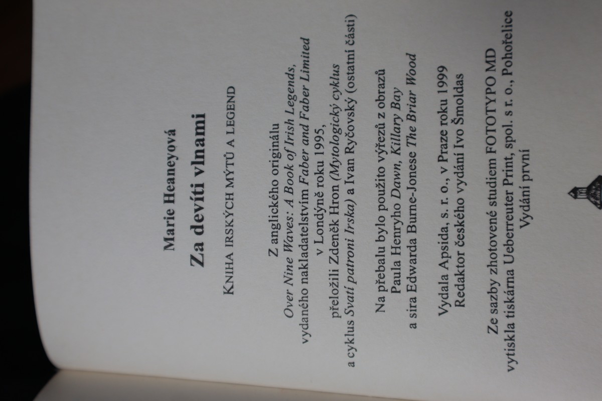 | Digitalizovaná tiráž: | Marie Heaneyová Za devíti vlnami KNIHA IRSKÝCH MÝTŮ A LEGEND Z anglického originálu Over Nine Waves: A Book of Irish Legends, vydaného nakladatelstvím Faber and Faber Limited v Londýně roku 1995, přeložili Zdeněk Hron (Mytologický cyklus a cyklus Svati patroni Irska) a Ivan Ryčovský (ostatní části) Na přebalu bylo použito výřezů z obrazů Paula Henryho Dawn, Killary Bay a sira Edwarda Burne-Jonese The Briar Wood Vydala Apsida, s. r. o., v Praze roku 1999 Redaktor českého vydání Ivo Šmoldas Ze sazby zhotovené studiem FOTOTYPO MD vytiskla tiskárna Ueberreuter Print, spol. s r. o., Pohořelice Vydání první |