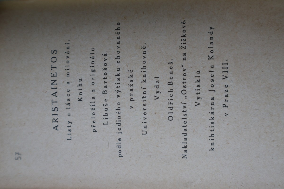 | Digitalizovaná tiráž: | 57 ARISTAINETOS Listy o lásce a milování. Knihu přeložila z originálu Libuše Bartošová podle jediného výtisku chovaného v pražské Universitní knihovně. Vydal Oldřich Beneš. Nakladatelství, Ostrov" na Žižkově. Vytiskla knih tiskárna Josefa Kolandy v Praze VIII. |