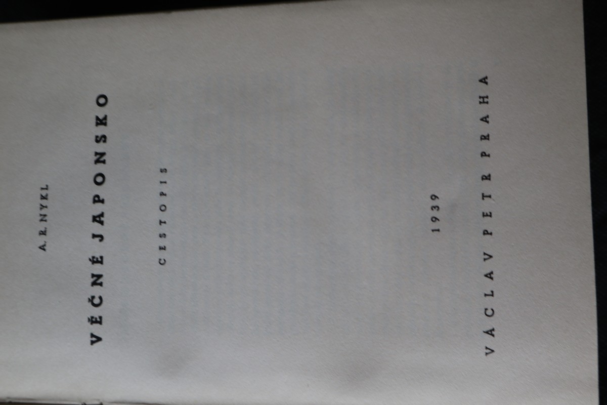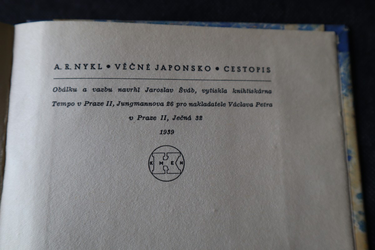 | Digitalizovaná tiráž: | A. R. NYKL VĚČNÉ JAPONSKO CESTOPIS Obálku a vazbu navrhl Jaroslav Sváb, vytiskla knihtiskárna Tempo v Praze II, Jungmannova 26 pro nakladatele Václava Petra v Praze II, Ječná 32 1939 M |