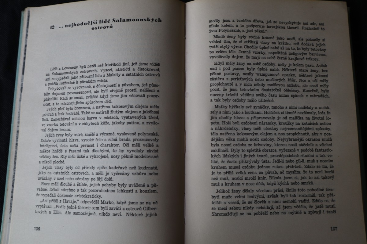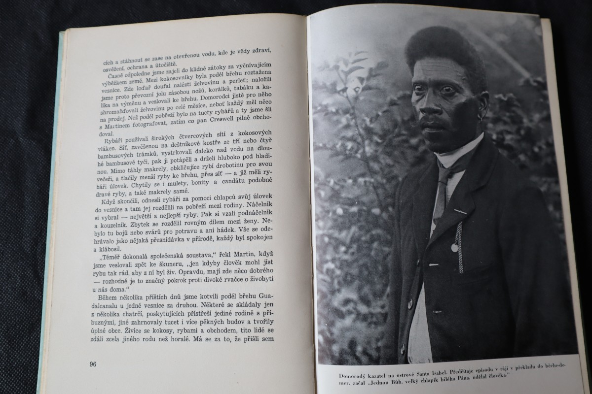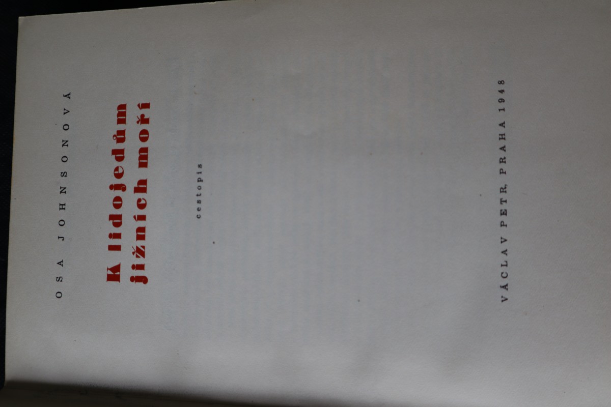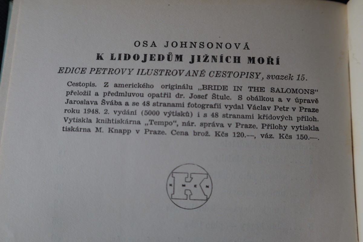 | Digitalizovaná tiráž: | OSA JOHNSONOVÁ K LIDOJEDŮM JIŽNÍCH MOŘÍ EDICE PETROVY ILUSTROVANÉ CESTOPISY, svazek 15. Cestopis. Z amerického originálu,,BRIDE IN THE SALOMONS" přeložil a předmluvou opatřil dr. Josef Štulc. S obálkou a v úpravě Jaroslava Švába a se 48 stranami fotografií vydal Václav Petr v Praze roku 1948. 2. vydání (5000 výtisků) is 48 stranami křídových příloh. Vytiskla knihtiskárna,,Tempo", nár. správa v Praze. Přílohy vytiskla tiskárna M. Knapp v Praze. Cena brož. Kčs 120.--, váz. Kčs 150.-. |