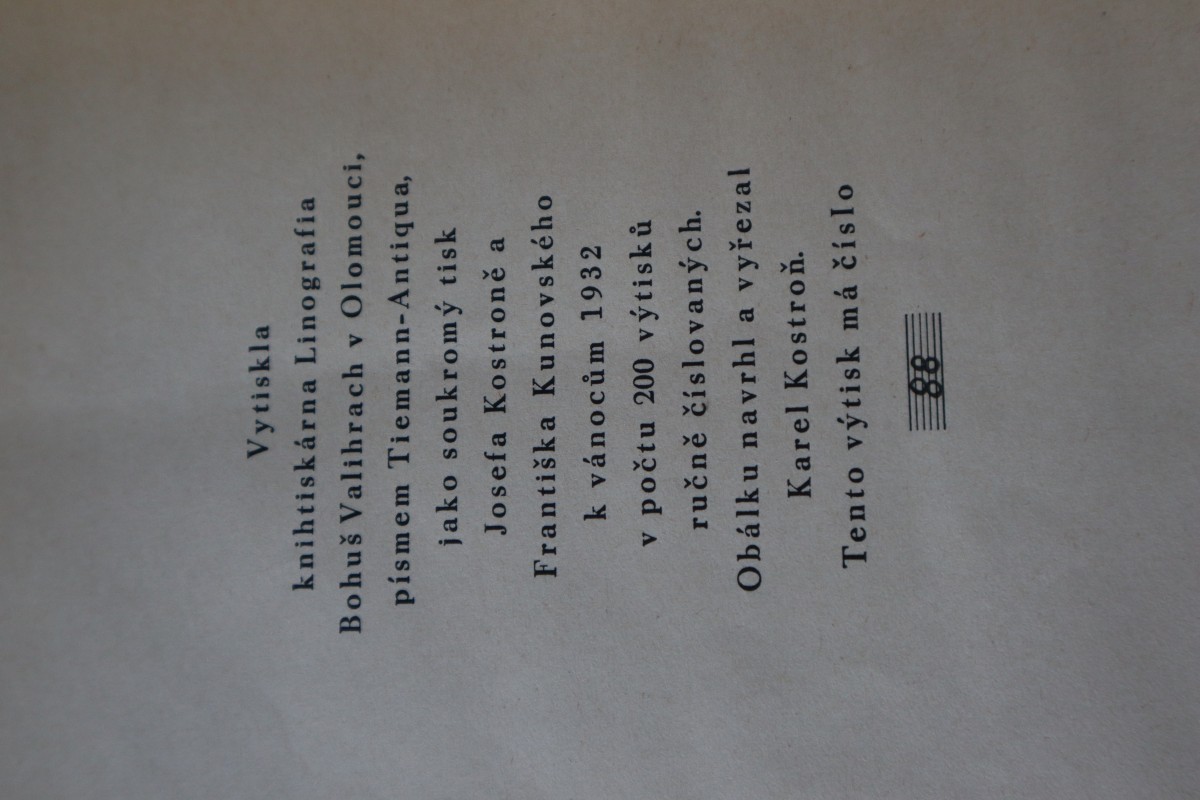 Digitalizovaná tiráž: | Vytiskla knihtiskárna Linografia Bohuš Valihrach v Olomouci, písmem Tiemann-Antiqua, jako soukromý tisk Josefa Kostroně a Františka Kunovského k vánocům 1932 v počtu 200 výtisků ručně číslovaných. Obálku navrhl a vyřezal Karel Kostroň. Tento výtisk má číslo 88 |