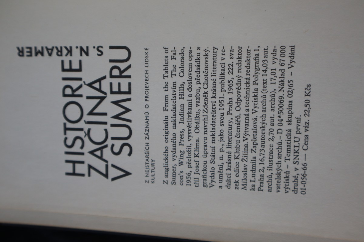 | Digitalizovaná tiráž: | HISTORIE ZACINA V SUMERU Z NEJSTARŠÍCH ZÁZNAMŮ O PROJEVECH LIDSKÉ KULTURY Z anglického originálu From the Tablets of Sumer, vydaného nakladatelstvím The Fal- con's Wing Press, Indian Hills, Colorado, 1956, přeložil, vysvětlivkami a doslovem opa- třil Josef Klíma. Obálku, vazbu, předsádku a grafickou úpravu navrhl Zdeněk Chotěnovský. Vydalo Státní nakladatelství krásné literatury a umění, n. p., jako svou 1951. publikaci v re- dakci krásné literatury, Praha 1965, 222. sva- zek edice Klubu čtenářů. Odpovědný redaktor Miloslav Žilina. Výtvarná a technická redaktor- ka Ludmila Zapletalová. Vytiskla Polygrafia 1, Praha 2, 16,73 autorských archů (text 14,03 aut. archů, ilustrace 2,70 aut. archů), 17,01 vyda- vatelských archů.- D 04*50069. Náklad 67 000 výtisků - Tematická skupina 02/65 - Vydání druhé, v SNKLU první. 01-056-66 - Cena váz. 22,50 Kčs |