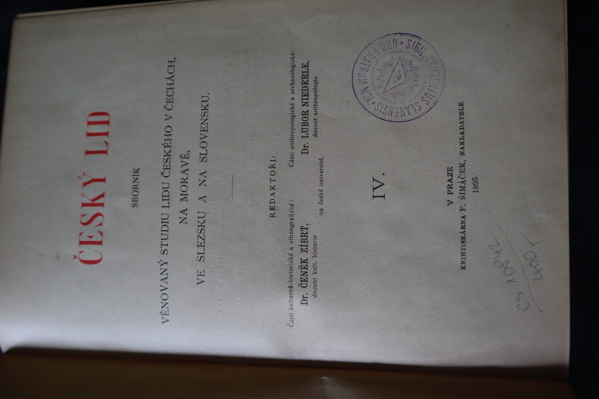 | Digitalizovaná tiráž: | ČESKÝ LID SBORNÍK VĚNOVANÝ STUDIU LIDU ČESKÉHO V ČECHÁCH, NA MORAVĚ, VE SLEZSKU A NA SLOVENSKU. REDAKTORI: Části kulturně-historické a ethnografické: Dr. ČENĚK ZÍBRT, docent kult. historie Části anthropologické a archaeologické: Dr. LUBOR NIEDERLE, docent anthropologie na české universitě. IV. SSLANENSIS NIN 7191S ORD FRATRU V PRAZE KNIHTISKÁRNA F. ŠIMÁČEK, NAKLADATELÉ Cs 10842 1895. 400 |
