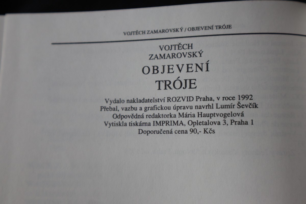 | Digitalizovaná tiráž: | VOJTĚCH ZAMAROVSKÝ / OBJEVENÍ TRÓJE VOJTĚCH ZAMAROVSKÝ OBJEVENÍ TRÓJE Vydalo nakladatelství ROZVID Praha, v roce 1992 Přebal, vazbu a grafickou úpravu navrhl Lumír Ševčík Odpovědná redaktorka Mária Hauptvogelová Vytiskla tiskárna IMPRIMA, Opletalova 3, Praha 1 Doporučená cena 90,- Kčs |
