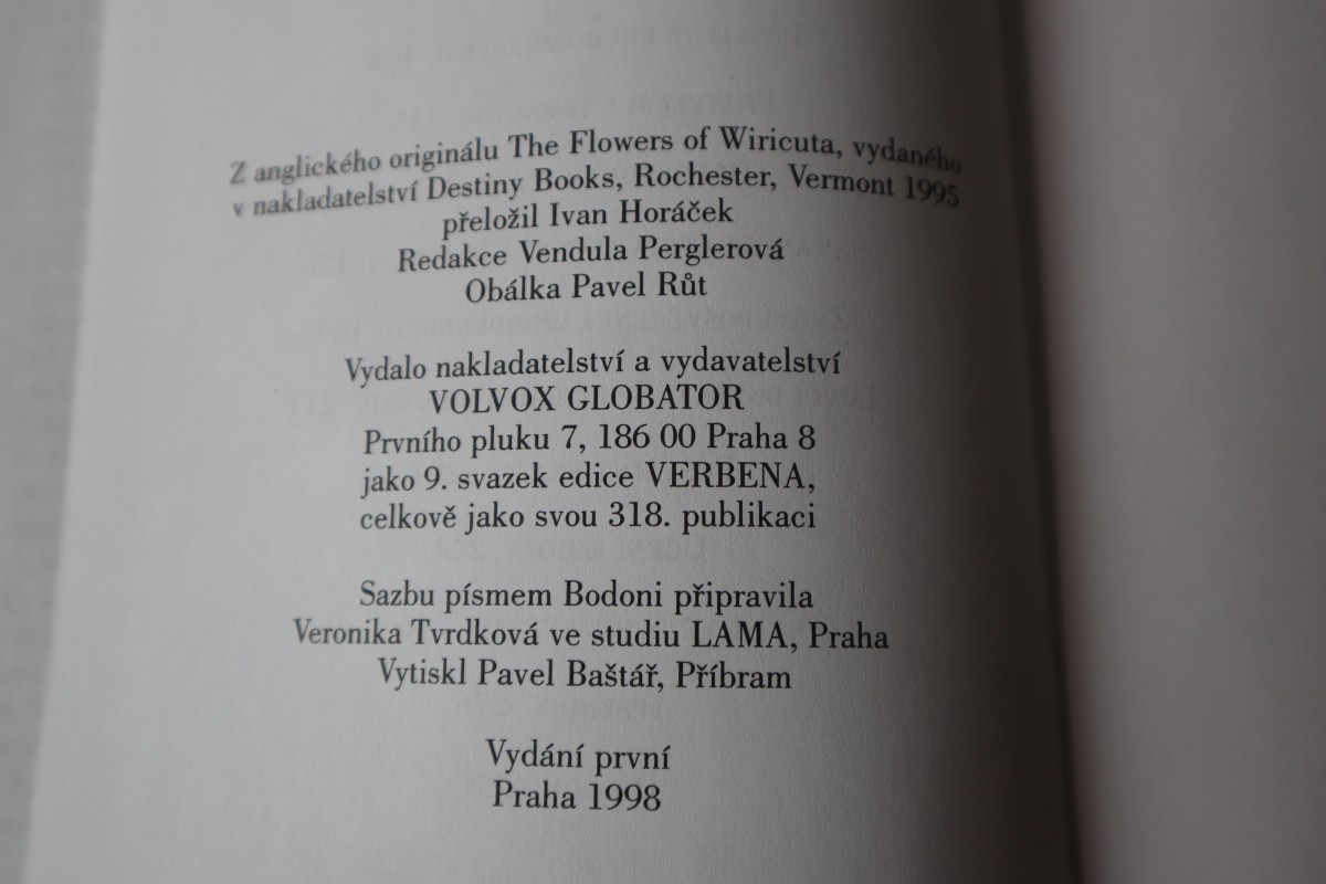 Digitalizovaná tiráž: | Z anglického originálu The Flowers of Wiricuta, vydaného v nakladatelství Destiny Books, Rochester, Vermont 1995 přeložil Ivan Horáček Redakce Vendula Perglerová Obálka Pavel Růt Vydalo nakladatelství a vydavatelství VOLVOX GLOBATOR Prvního pluku 7, 186 00 Praha 8 jako 9. svazek edice VERBENA, celkově jako svou 318. publikaci Sazbu písmem Bodoni připravila Veronika Tvrdková ve studiu LAMA, Praha Vytiskl Pavel Baštář, Příbram Vydání první Praha 1998 |