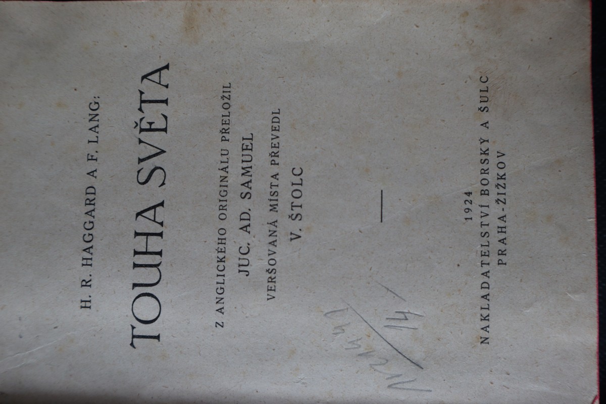 Digitalizovaná tiráž: | H. R. HAGGARD A F. LANG: TOUHA SVĚTA Z ANGLICKÉHO ORIGINÁLU PŘELOŽIL JUC. AD. SAMUEL VERŠOVANÁ MÍSTA PŘEVEDL V. ŠTOLC 1121447 1924 NAKLADATELSTVÍ BORSKÝ A ŠULC PRAHA-ŽIŽKOV |