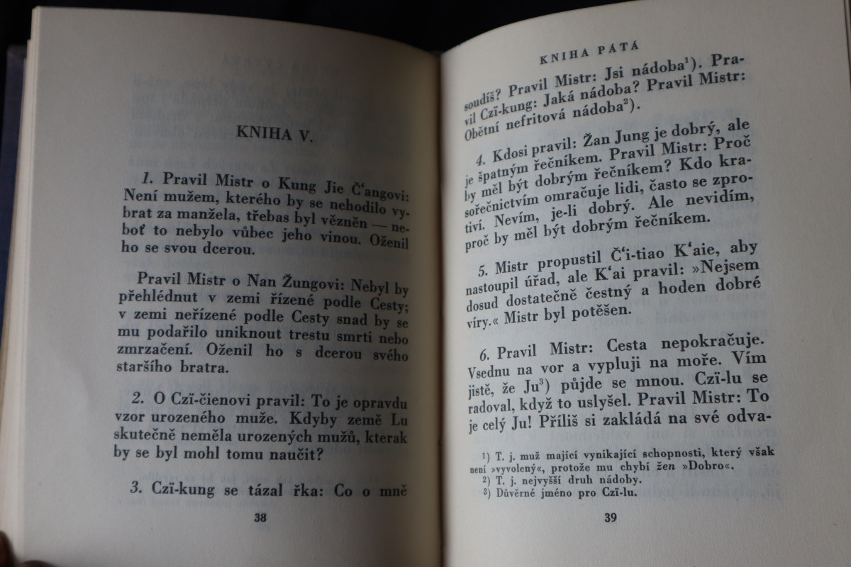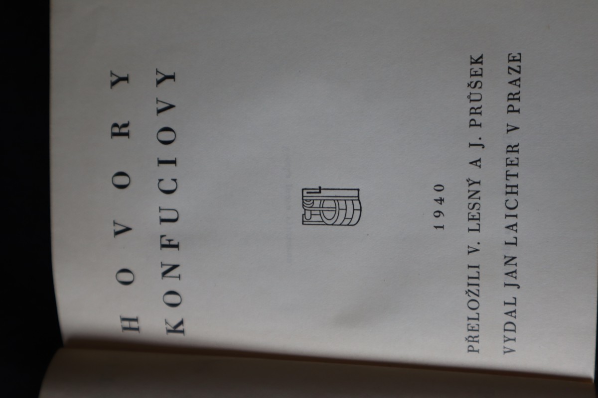 Digitalizovaná tiráž: | HOVORY KONFUCIOVY 1940 PŘELOŽILI V. LESNÝ A J. PRŮŠEK VYDAL JAN LAICHTER V PRAZE |