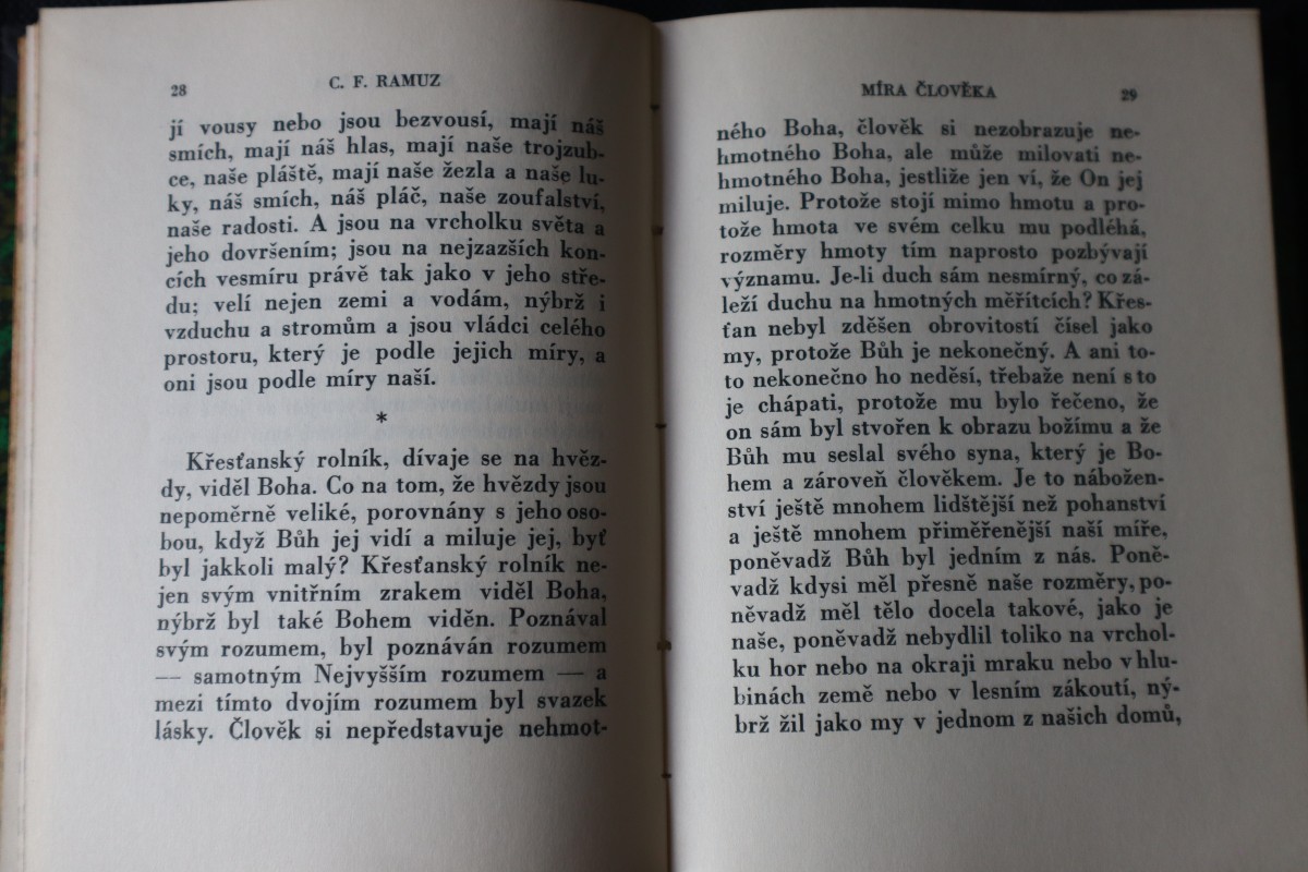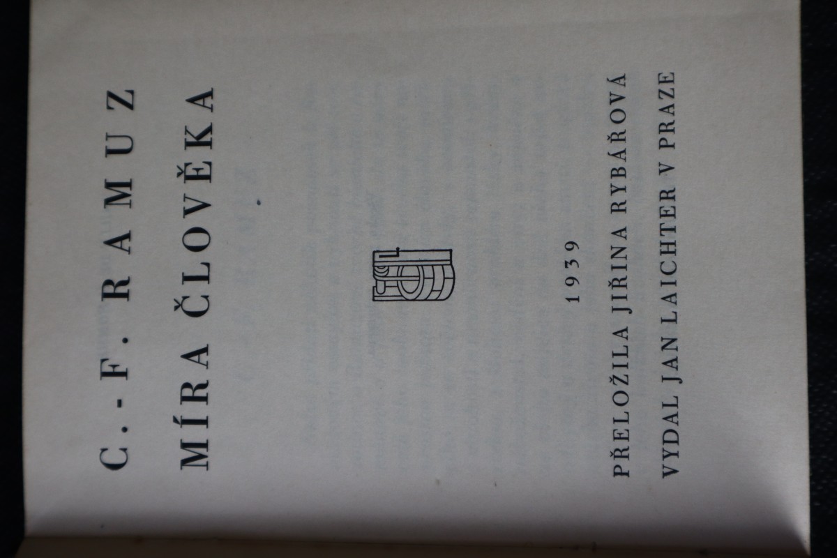 Digitalizovaná tiráž: | C. F. RAMUZ - MÍRA ČLOVĚKA 1939 PŘELOŽILA JIŘINA RYBÁŘOVÁ VYDAL JAN LAICHTER V PRAZE |