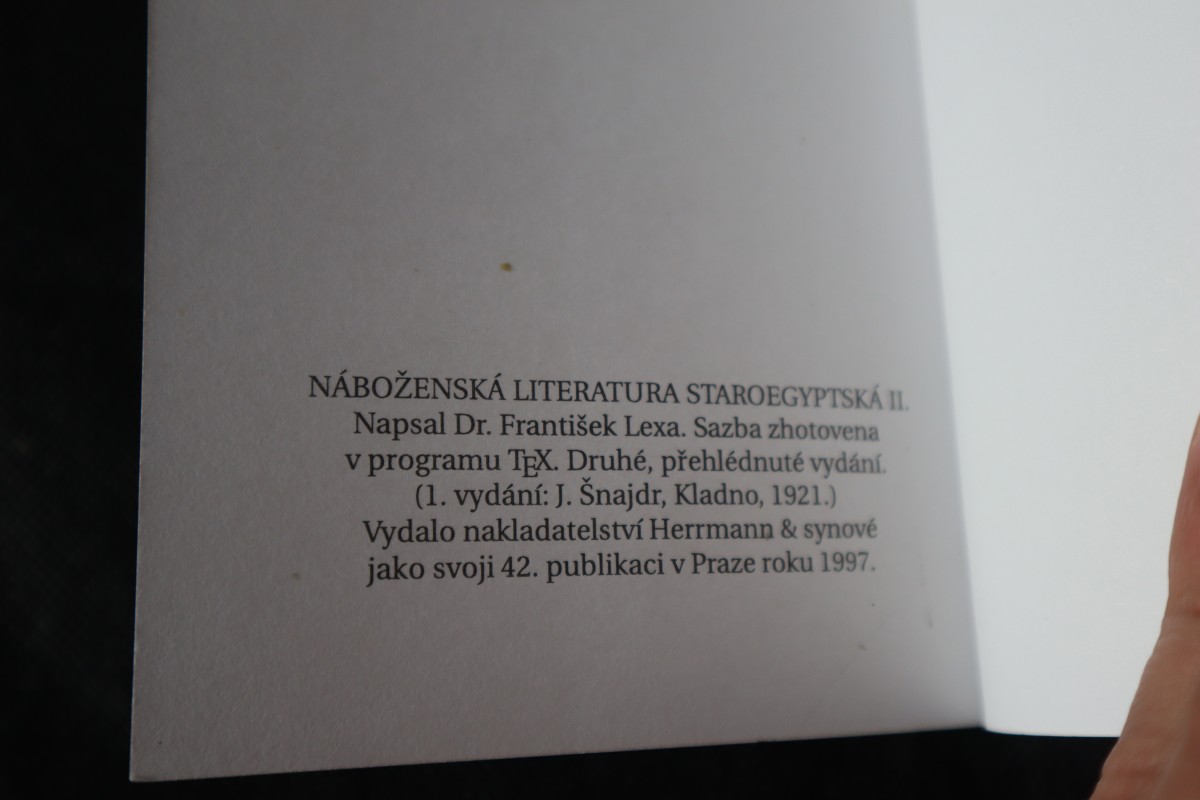 | Digitalizovaná tiráž: | NÁBOŽENSKÁ LITERATURA STAROEGYPTSKÁ II. Napsal Dr. František Lexa. Sazba zhotovena v programu TEX. Druhé, přehlédnuté vydání. (1. vydání: J. Šnajdr, Kladno, 1921.) Vydalo nakladatelství Herrmann & synové jako svoji 42. publikaci v Praze roku 1997. |