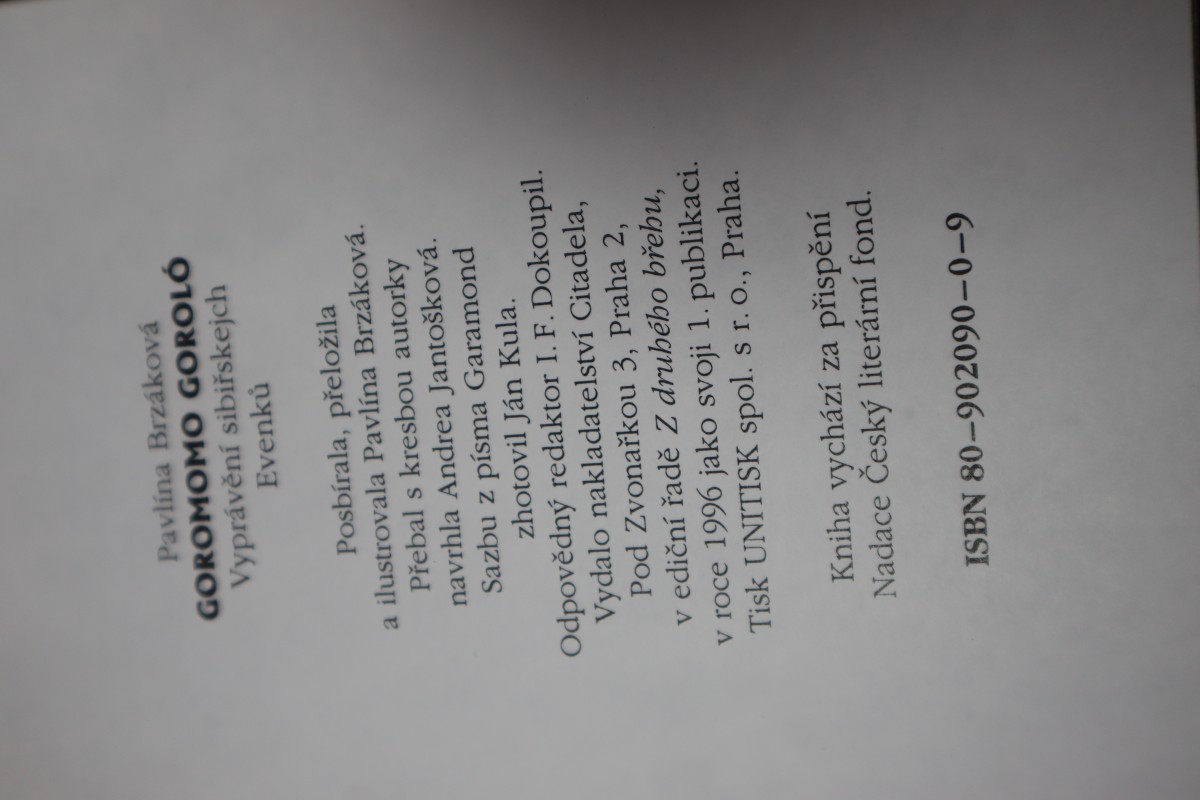 Digitalizovaná tiráž: | Pavlína Brzáková GOROMOMO GOROLÓ Vyprávění sibiřskejch Evenků Posbírala, přeložila a ilustrovala Pavlína Brzáková. Přebal s kresbou autorky navrhla Andrea Jantošková. Sazbu z písma Garamond zhotovil Ján Kula. Odpovědný redaktor I. F. Dokoupil. Vydalo nakladatelství Citadela, Pod Zvonařkou 3, Praha 2, v ediční řadě Z druhého břehu, v roce 1996 jako svoji 1. publikaci. Tisk UNITISK spol. s r. o., Praha. Kniha vychází za přispění Nadace Český literární fond. ISBN 80-902090-0-9 |