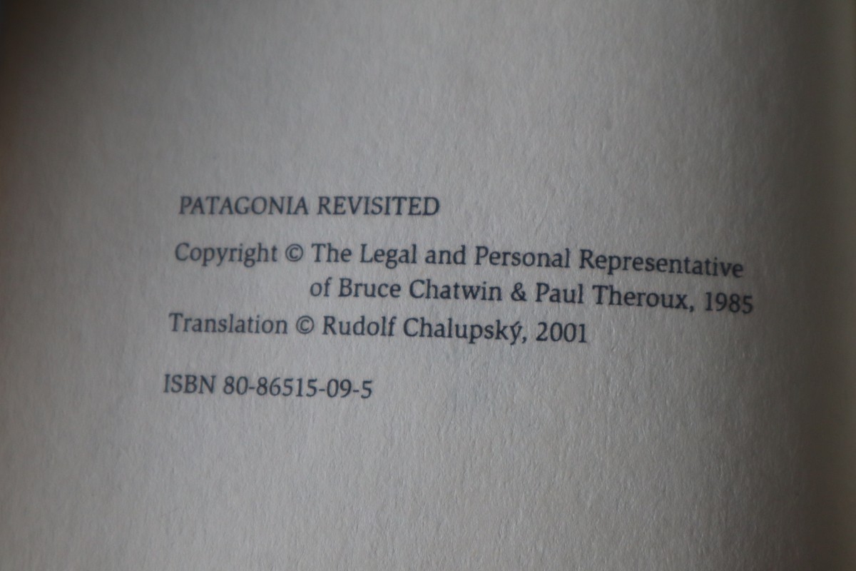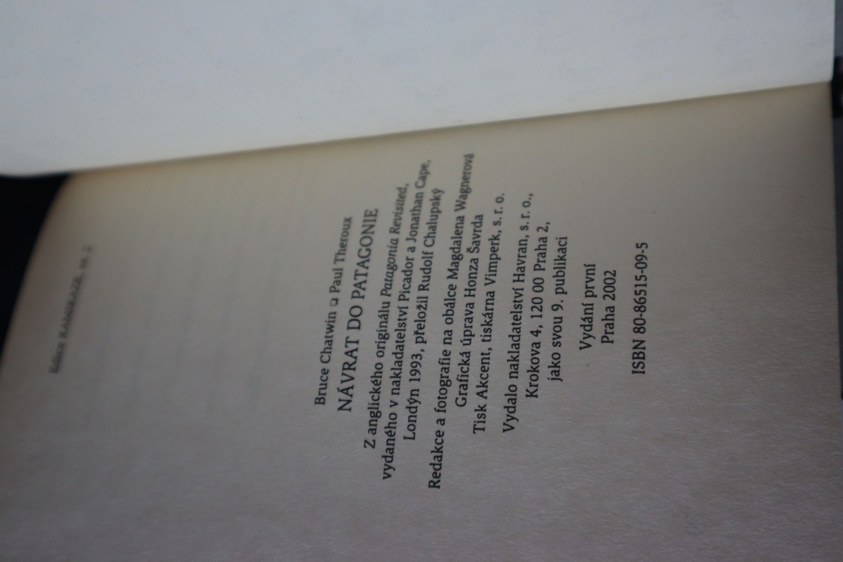 Digitalizovaná tiráž: | Edice KAMIKAZE, 2 Bruce Chatwin a Paul Theroux NÁVRAT DO PATAGONIE Z anglického originálu Patagonia Revisited, vydaného v nakladatelství Picador a Jonathan Cape, Londýn 1993, přeložil Rudolf Chalupský Redakce a fotografie na obálce Magdalena Wagnerová Grafická úprava Honza Šavrda Tisk Akcent, tiskárna Vimperk, s. r. O. Vydalo nakladatelství Havran, s. r. o., Krokova 4, 120 00 Praha 2, jako svou 9. publikaci Vydání první Praha 2002 ISBN 80-86515-09-5 |