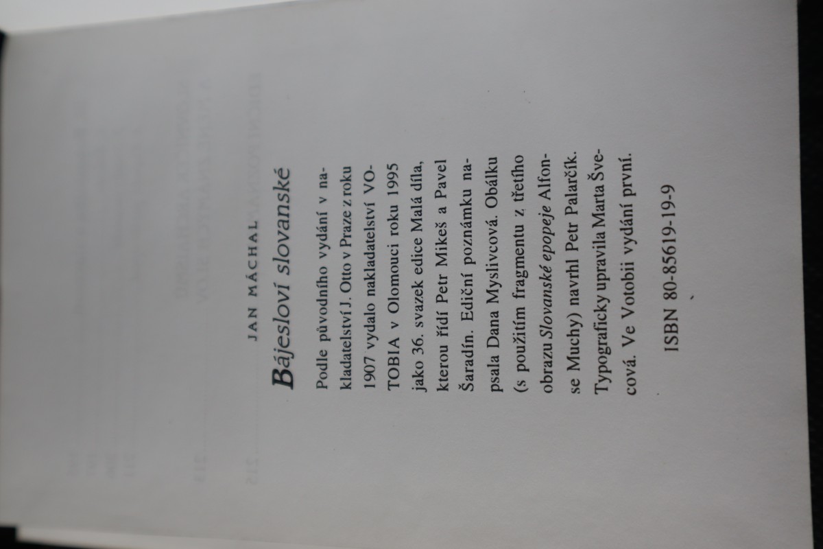 Digitalizovaná tiráž: | JAN MÁCHAL Bájesloví slovanské Podle původního vydání v na- kladatelství J. Otto v Praze z roku 1907 vydalo nakladatelství VO- TOBIA v Olomouci roku 1995 jako 36. svazek edice Malá díla, kterou řídí Petr Mikeš a Pavel Šaradín. Ediční poznámku na- psala Dana Myslivcová. Obálku (s použitím fragmentu z třetího obrazu Slovanské epopeje Alfon- se Muchy) navrhl Petr Palarčík. Typograficky upravila Marta Šve- cová. Ve Votobii vydání první. ISBN 80-85619-19-9 |