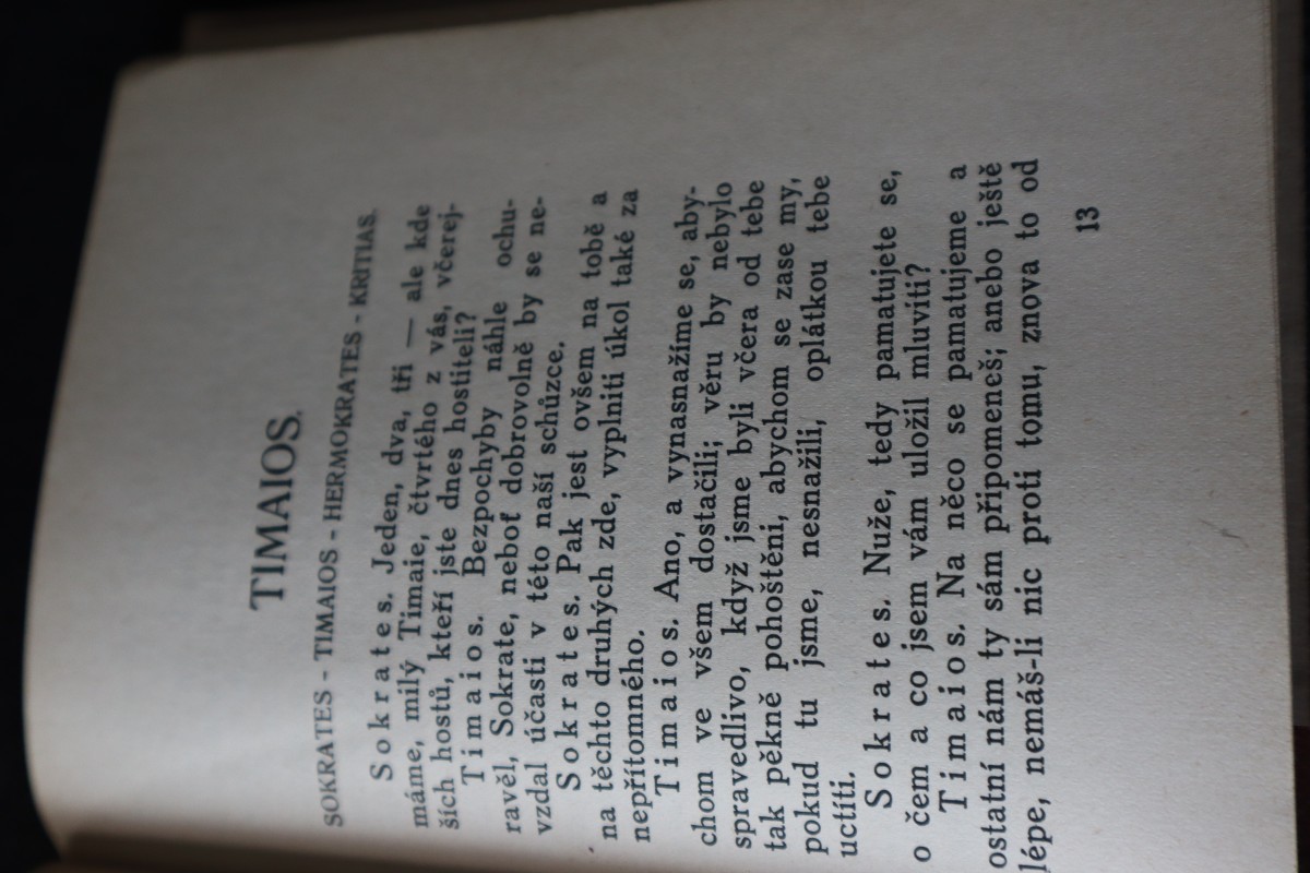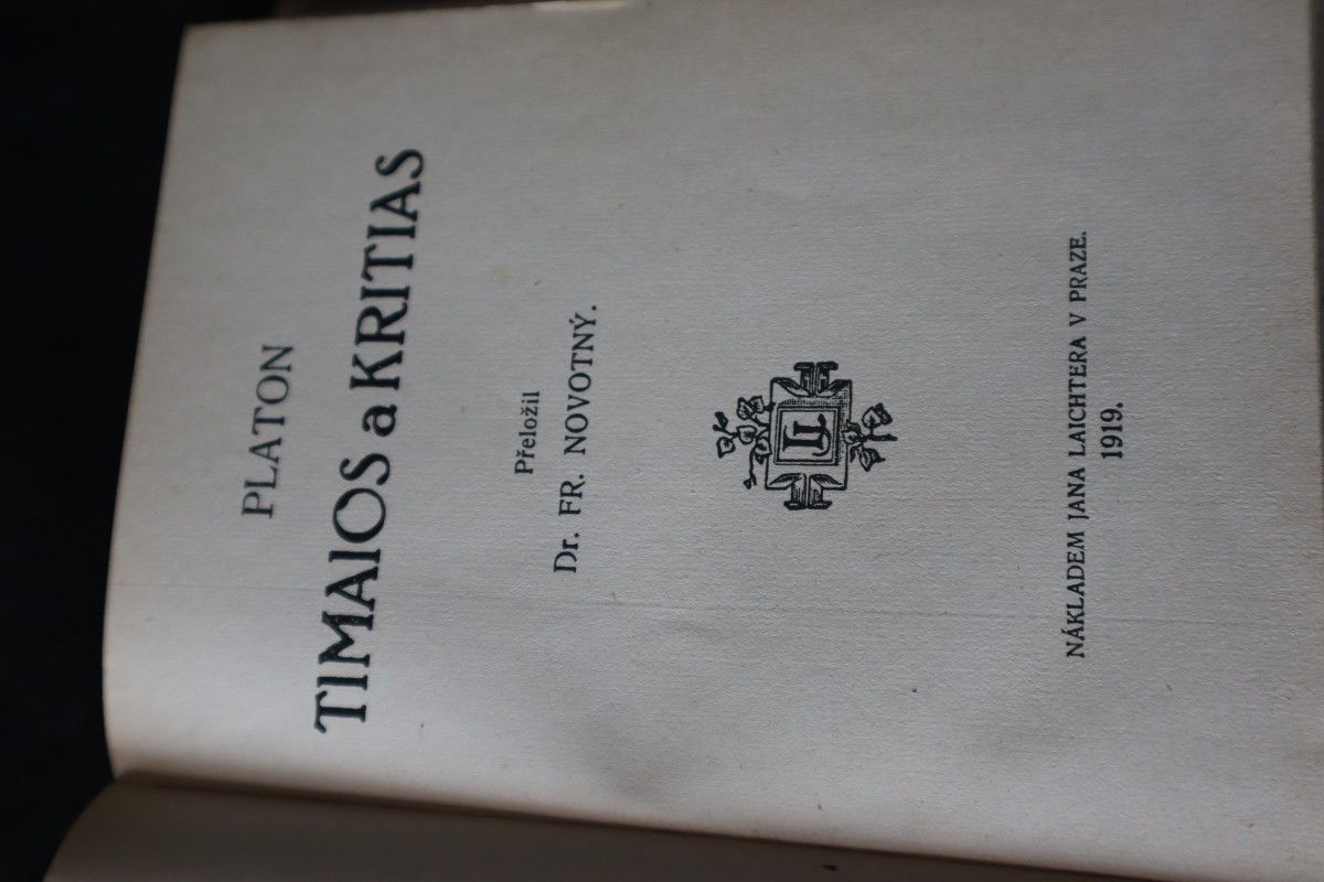 Digitalizovaná tiráž: | PLATON TIMAIOS a KRITIAS Přeložil Dr. FR. NOVOTNÝ. NÁKLADEM JANA LAICHTERA V PRAZE. 1919. |