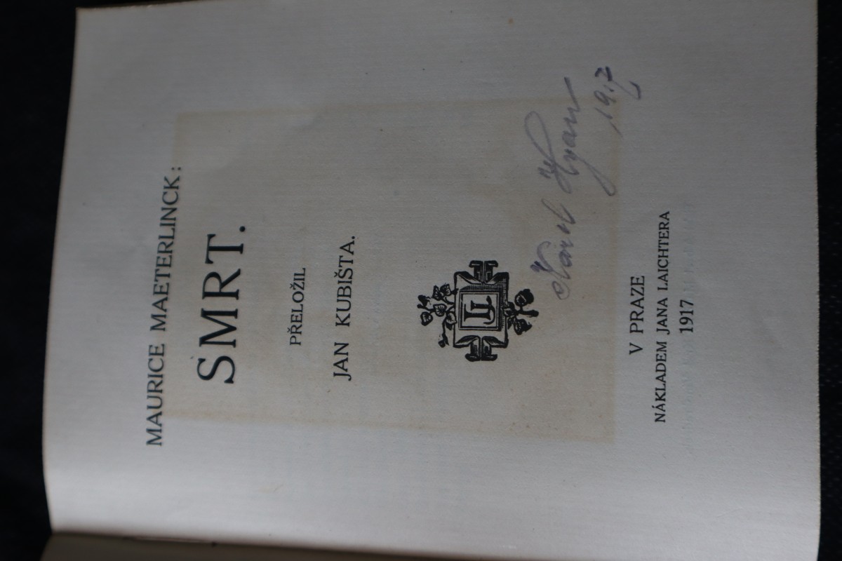 Digitalizovaná tiráž: | MAURICE MAETERLINCK: SMRT. PŘELOŽIL JAN KUBIŠTA. Sarel Hran V PRAZE NÁKLADEM JANA LAICHTERA 1917 d 1917 |