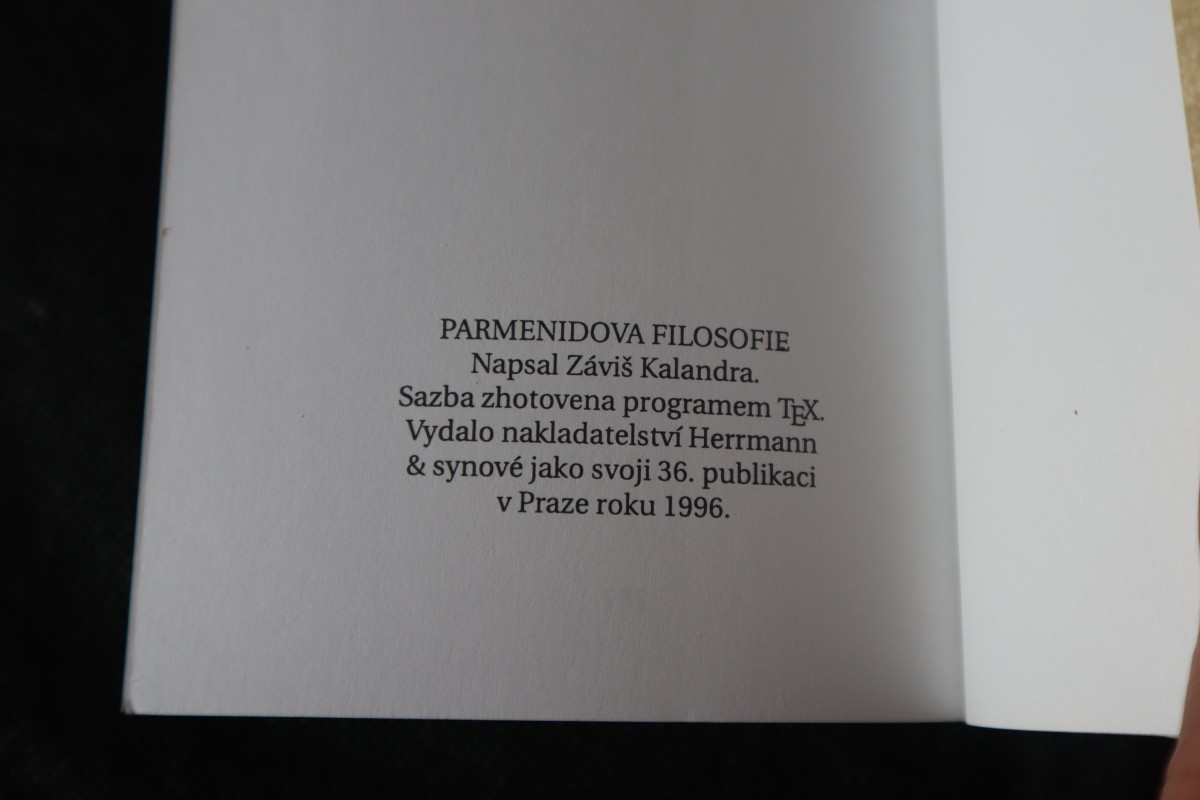 Digitalizovaná tiráž: | PARMENIDOVA FILOSOFIE Napsal Záviš Kalandra. Sazba zhotovena programem TEX. Vydalo nakladatelství Herrmann & synové jako svoji 36. publikaci v Praze roku 1996. |