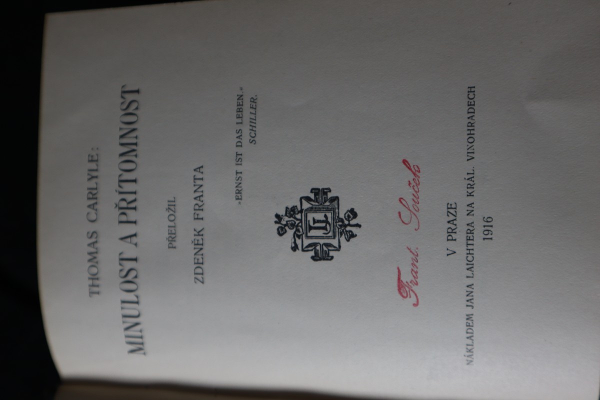 Digitalizovaná tiráž: | THOMAS CARLYLE: MINULOST A PRÍTOMNOST PŘELOŽIL ZDENĚK FRANTA -ERNST IST DAS LEBEN. SCHILLER. Frant. Soucele V PRAZE NÁKLADEM JANA LAICHTERA NA KRÁL. VINOHRADECH 1916 |