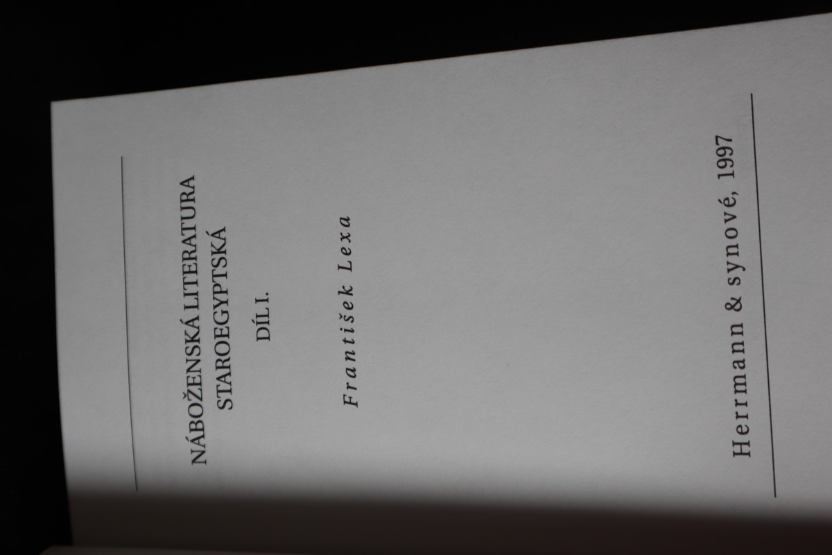 | Digitalizovaná tiráž: | NÁBOŽENSKÁ LITERATURA STAROEGYPTSKÁ I. Napsal Dr. František Lexa. Sazba zhotovena v programu TEX. Druhé, přehlédnuté vydání. (1. vydání: J. Šnajdr, Kladno, 1921.) Vydalo nakladatelství Herrmann & synové jako svoji 41. publikaci v Praze roku 1997. |
