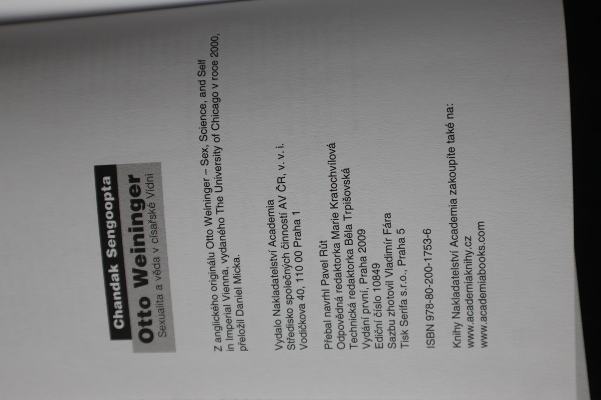 Digitalizovaná tiráž: | Chandak Sengoopta Otto Weininger Sexualita a věda v císařské Vídni Z anglického originálu Otto Weininger - Sex, Science, and Self in Imperial Vienna, vydaného The University of Chicago v roce 2000, přeložil Daniel Micka. Vydalo Nakladatelství Academia Středisko společných činností AV ČR, v. v. i. Vodičkova 40, 110 00 Praha 1 Přebal navrhl Pavel Růt Odpovědná redaktorka Marie Kratochvílová Technická redaktorka Běla Trpišovská Vydání první, Praha 2009 Ediční číslo 10849 Sazbu zhotovil Vladimír Fára Tisk Serifa s.r.o., Praha 5 ISBN 978-80-200-1753-6 Knihy Nakladatelství Academia zakoupíte také na: www.academiaknihy.cz www.academiabooks.com |