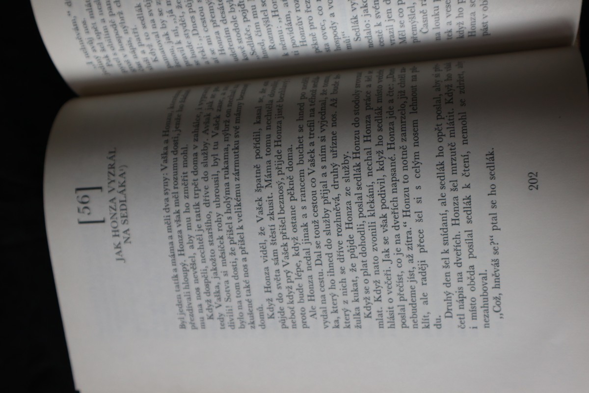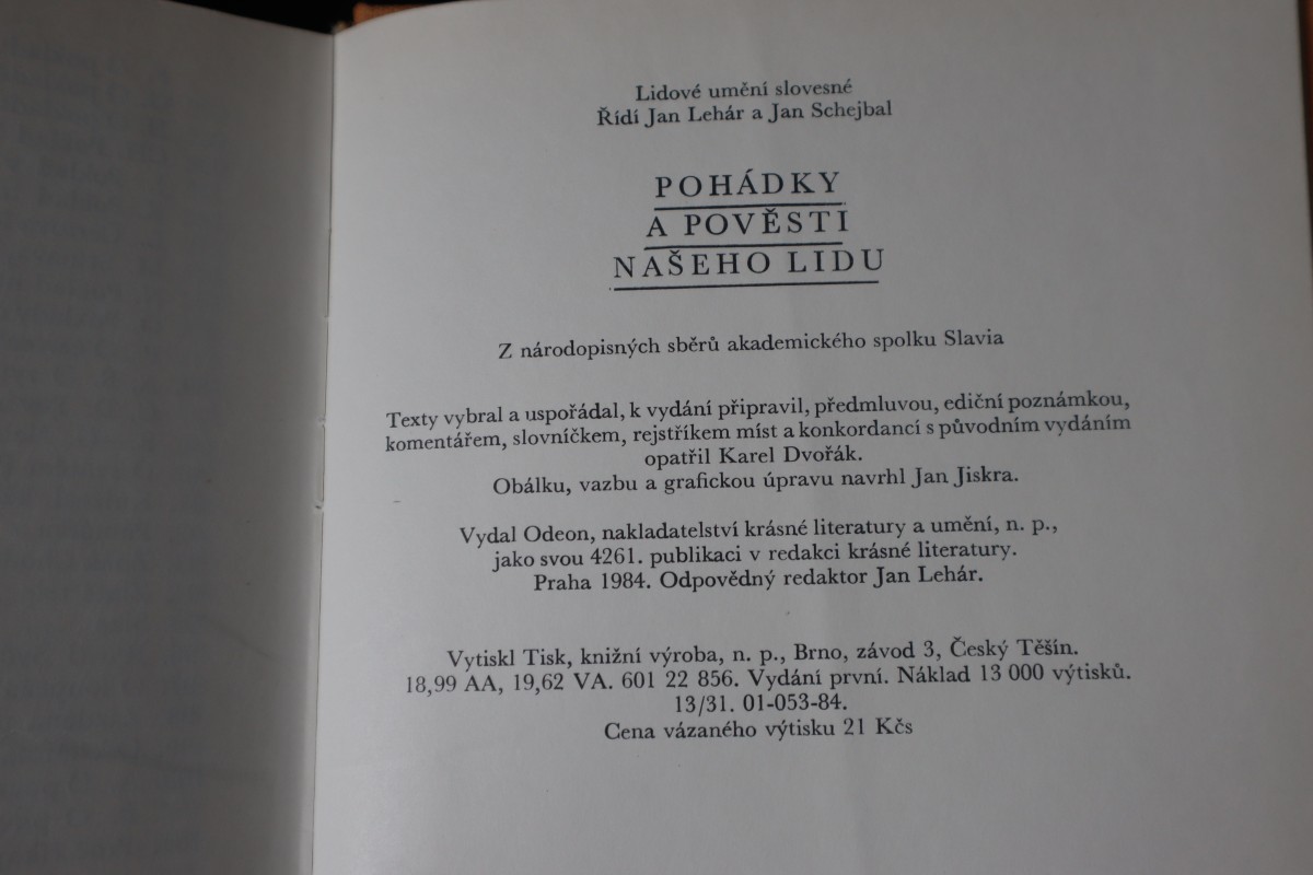 Digitalizovaná tiráž: | Lidové umění slovesné Řídí Jan Lehár a Jan Schejbal POHÁDKY A POVĚSTI NAŠEHO LIDU Z národopisných sběrů akademického spolku Slavia Texty vybral a uspořádal, k vydání připravil, předmluvou, ediční poznámkou, komentářem, slovníčkem, rejstříkem míst a konkordancí s původním vydáním opatřil Karel Dvořák. Obálku, vazbu a grafickou úpravu navrhl Jan Jiskra. Vydal Odeon, nakladatelství krásné literatury a umění, n. p., jako svou 4261. publikaci v redakci krásné literatury. Praha 1984. Odpovědný redaktor Jan Lehár. Vytiskl Tisk, knižní výroba, n. p., Brno, závod 3, Český Těšín. 18,99 AA, 19,62 VA. 601 22 856. Vydání první. Náklad 13 000 výtisků. 13/31. 01-053-84. Cena vázaného výtisku 21 Kčs |