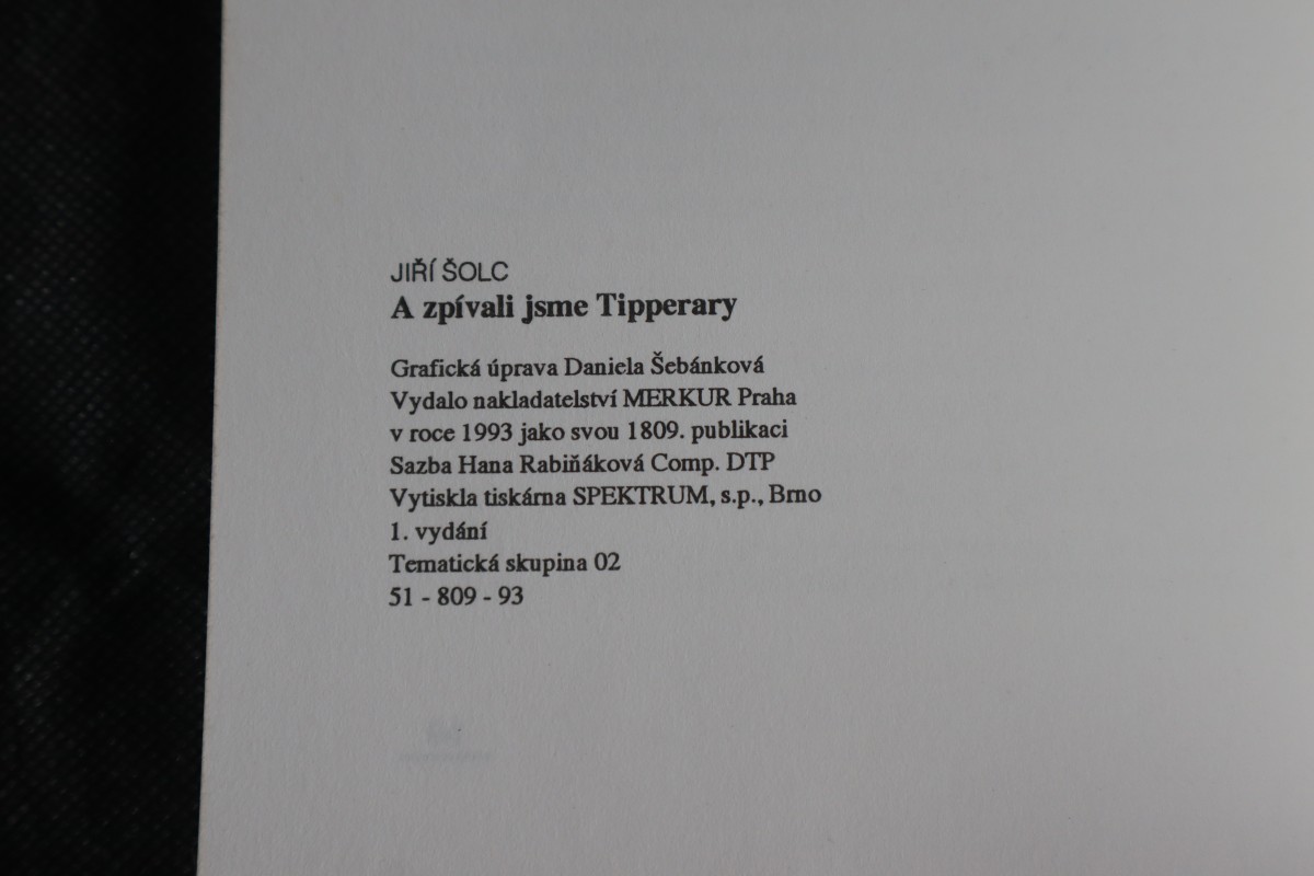Digitalizovaná tiráž: | JIŘÍ ŠOLC A zpívali jsme Tipperary Grafická úprava Daniela Šebánková Vydalo nakladatelství MERKUR Praha v roce 1993 jako svou 1809. publikaci Sazba Hana Rabiňáková Comp. DTP Vytiskla tiskárna SPEKTRUM, s.p., Brno 1. vydání Tematická skupina 02 51-809-93 |