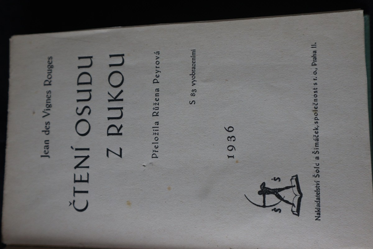 Digitalizovaná tiráž: | Jean des Vignes Rouges ČTENÍ OSUDU Z RUKOU Přeložila Růžena Peyrová 1936 S 83 vyobrazeními Nakladatelství Šolc a Šimáček, společnost s r. o., Praha II. |