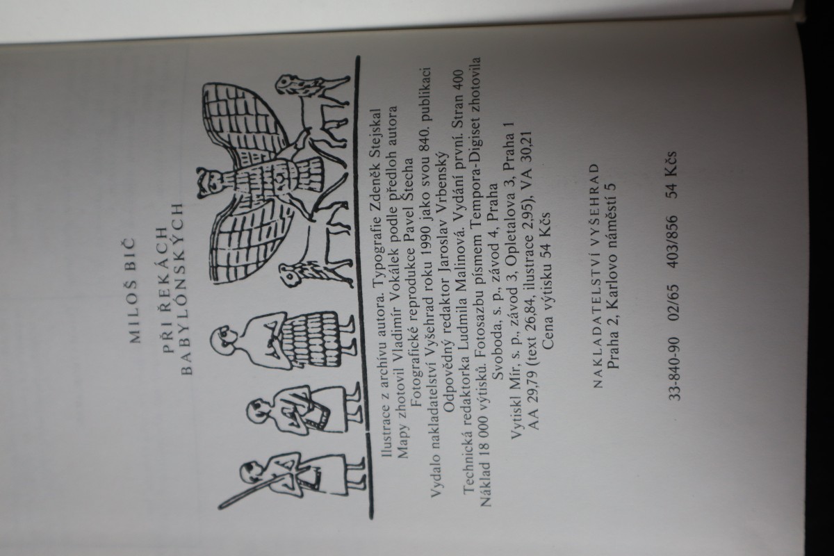 Digitalizovaná tiráž: | MILOŠ BIČ PŘI ŘEKÁCH BABYLONSKÝCH Ilustrace z archívu autora. Typografie Zdeněk Stejskal Mapy zhotovil Vladimír Vokálek podle předloh autora Fotografické reprodukce Pavel Štecha Vydalo nakladatelství Vyšehrad roku 1990 jako svou 840. publikaci Odpovědný redaktor Jaroslav Vrbenský Technická redaktorka Ludmila Malinová. Vydání první. Stran 400 Náklad 18 000 výtisků. Fotosazbu písmem Tempora-Digiset zhotovila Svoboda, s. p., závod 4, Praha Vytiskl Mír, s. p., závod 3, Opletalova 3, Praha 1 AA 29,79 (text 26,84, ilustrace 2,95), VA 30,21 Cena výtisku 54 Kčs NAKLADATELSTVÍ VYŠEHRAD Praha 2, Karlovo náměstí 5 33-840-90 02/65 403/856 54 Kčs |