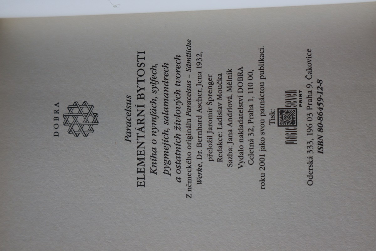 Digitalizovaná tiráž: | DOBRA Paracelsus ELEMENTÁRNÍ BYTOSTI Kniha o nymfách, sylfech, pygmejích, salamandrech a ostatních živlových tvorech Z německého originálu Paracelsus - Sämtliche Werke, Dr. Bernhard Ascher, Jena 1932, přeložil Jaromír Šprenger Redakce: Ladislav Moučka Sazba: Jana Andrlová, Mělník Vydalo nakladatelství DOBRA Celetná 32, Praha 1, 110 00, roku 2001 jako svou patnáctou publikaci. Tisk: MaGic seven PRINT Oderská 333, 196 03 Praha 9, Čakovice ISBN 80-86459-12-8 |