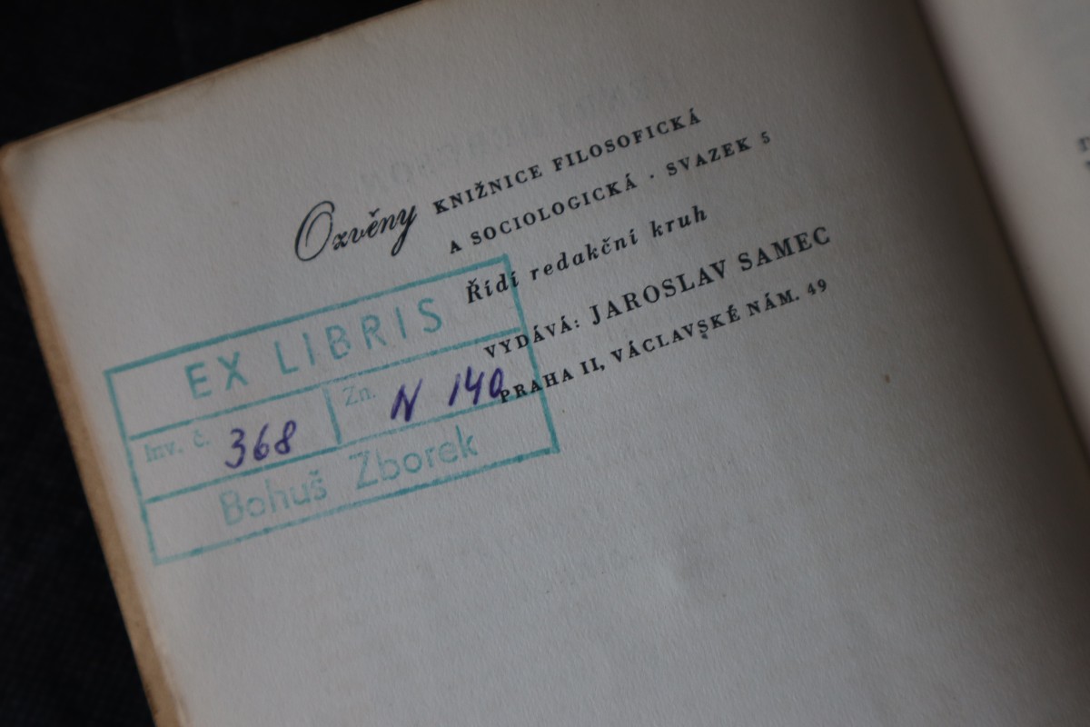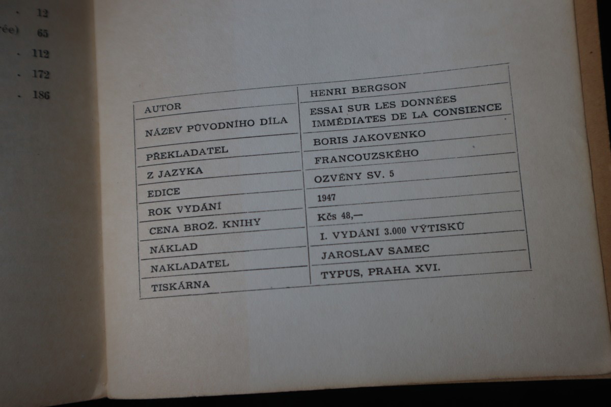 Digitalizovaná tiráž: | 12 rée) 65 .112 172 . 186 AUTOR NÁZEV PŮVODNÍHO DÍLA PŘEKLADATEL Z JAZYKA EDICE ROK VYDÁNÍ CENA BROZ. KNIHY NÁKLAD NAKLADATEL TISKÁRNA HENRI BERGSON ESSAI SUR LES DONNÉES IMMEDIATES DE LA CONSIENCE BORIS JAKOVENKO FRANCOUZSKÉHO OZVÉNY SV. 5 1947 Kčs 48,- I. VYDANI 3.000 VÝTISKU JAROSLAV SAMEC TYPUS, PRAHA XVI. |