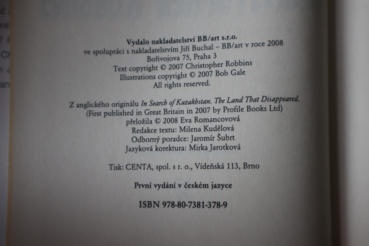 Digitalizovaná tiráž: | nil 2 F C an Vydalo nakladatelství BB/art s.r.o. ve spolupráci s nakladatelstvím Jiří Buchal - BB/art v roce 2008 Bořivojova 75, Praha 3 Text copyright © 2007 Christopher Robbins Illustrations copyright © 2007 Bob Gale All rights reserved. Z anglického originálu In Search of Kazakhstan. The Land That Disappeared. (First published in Great Britain in 2007 by Profile Books Ltd) přeložila ©2008 Eva Romancovová Redakce textu: Milena Kudělová Odborný poradce: Jaromír Šubrt Jazyková korektura: Mirka Jarotková Tisk: CENTA, spol. s r. o., Vídeňská 113, Brno První vydání v českém jazyce ISBN 978-80-7381-378-9 |
