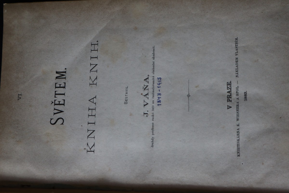 Digitalizovaná tiráž: | VI. SVĚTEM. KNIHA KNIH SESTAVIL J. VÁŇA, druhdy profesor ruské felt as českosloranské obchodní akademii. 1848 -1915 V PRAZE. KNIHTISKÁRNA K. WIESNERA A SPOL. NÁKLADEM VLASTNÍM. 1883. |