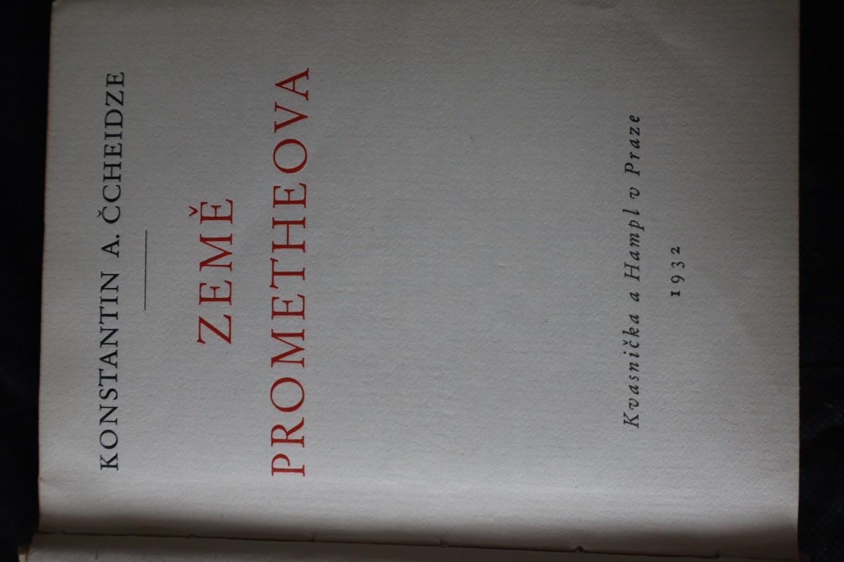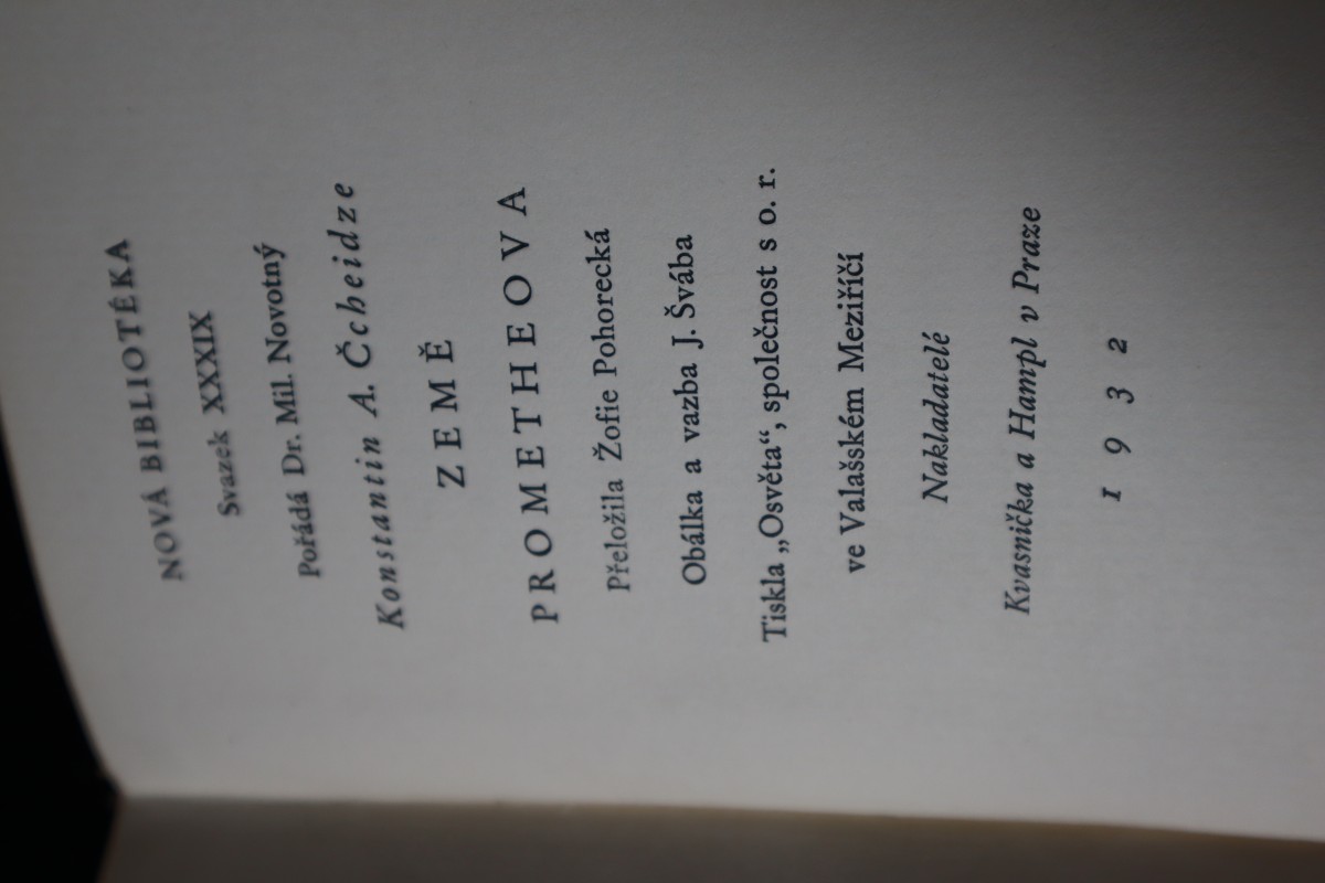 Digitalizovaná tiráž: | NOVÁ BIBLIOTEKA Svazek XXXIX Pořádá Dr. Mil. Novotný Konstantin A. Čcheidze ZEMĚ PROMETHEOVA Přeložila Žofie Pohorecká Obálka a vazba J. Švába Tiskla,,Osvěta“, společnost s o. r. ve Valašském Meziříčí Nakladatelé Kvasnička a Hampl v Praze 1932 |